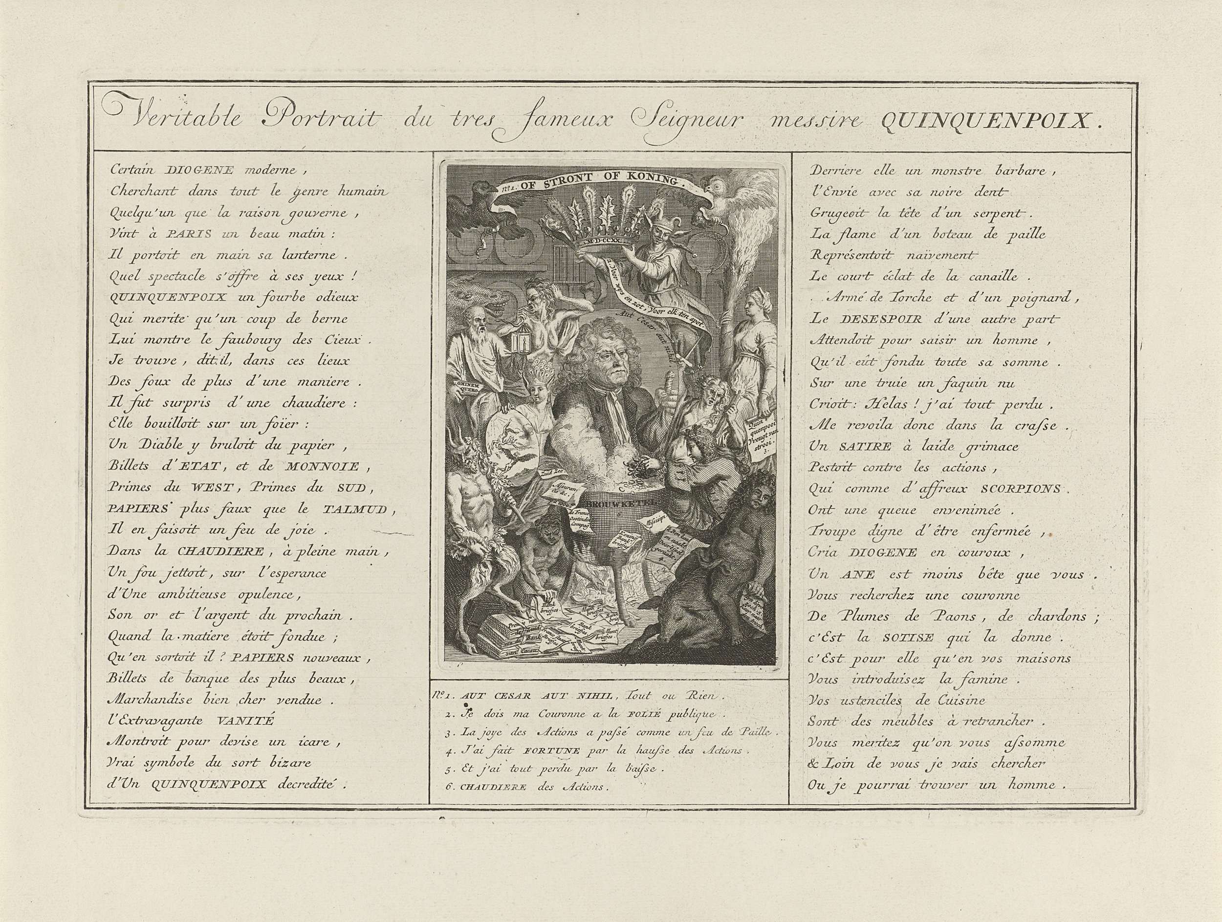 Ware afbeelding van de heer Quinquempoix. Portretmedaillon van John Law als de heer Quinquempoix boven een brouwketel waarin geldstukken worden omgetoverd tot aandelen. Heksenketel met duivels, uilen en andere wezens. Boven het portret de Zotheid met een kroon van pauwenveren en hulstbladeren. Hierboven een banderol met: No. 1 Of Stront of Koning. Deze plaat afgedrukt ...