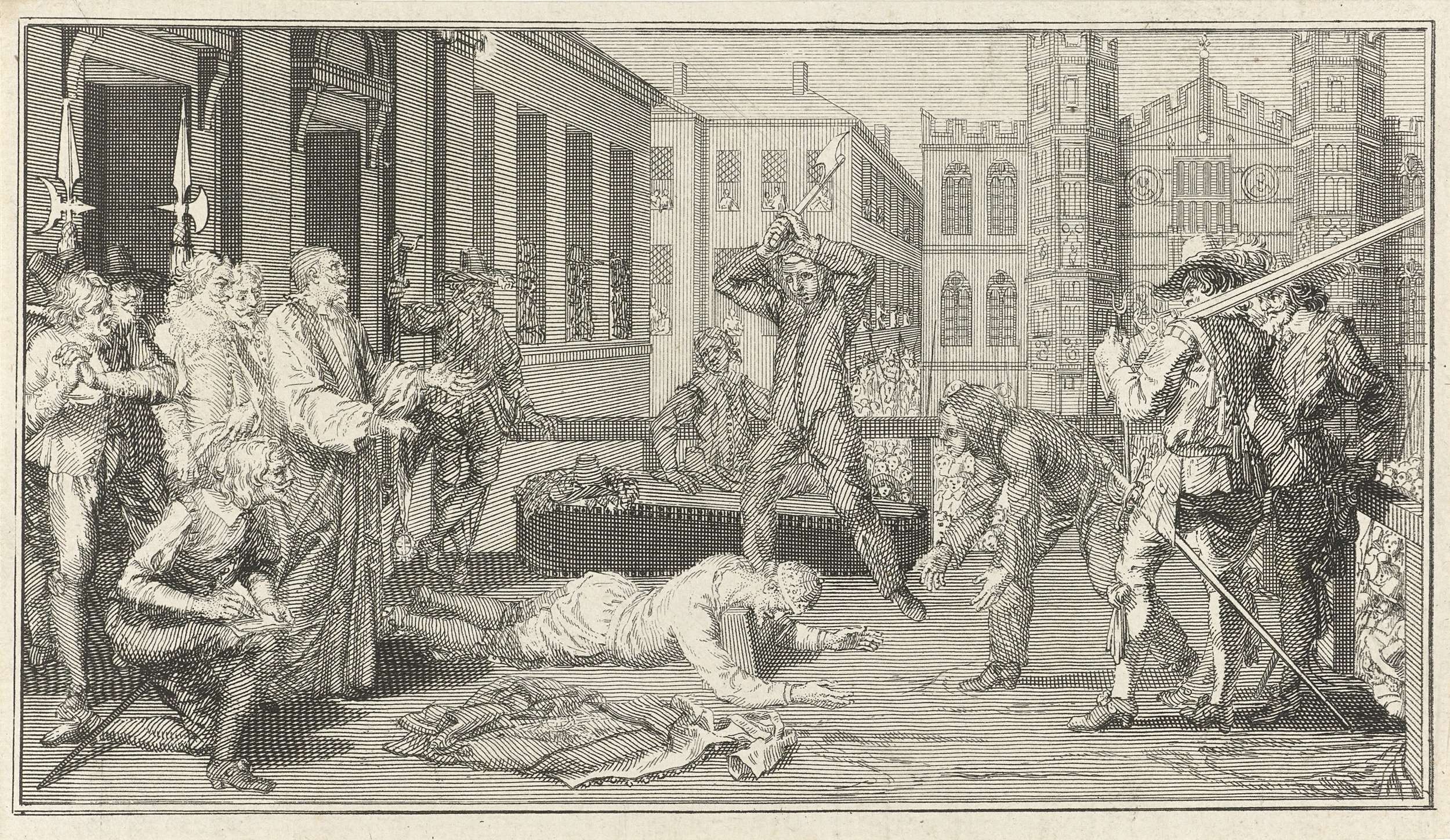 De onthoofding van Karel I op 30 januari 1649. Hij is de enige Britse vorst ooit die werd afgezet en onthoofd. De beul staat op het punt zijn hoofd af te slaan met een bijl. Een geestelijke en andere omstanders kijken toe.