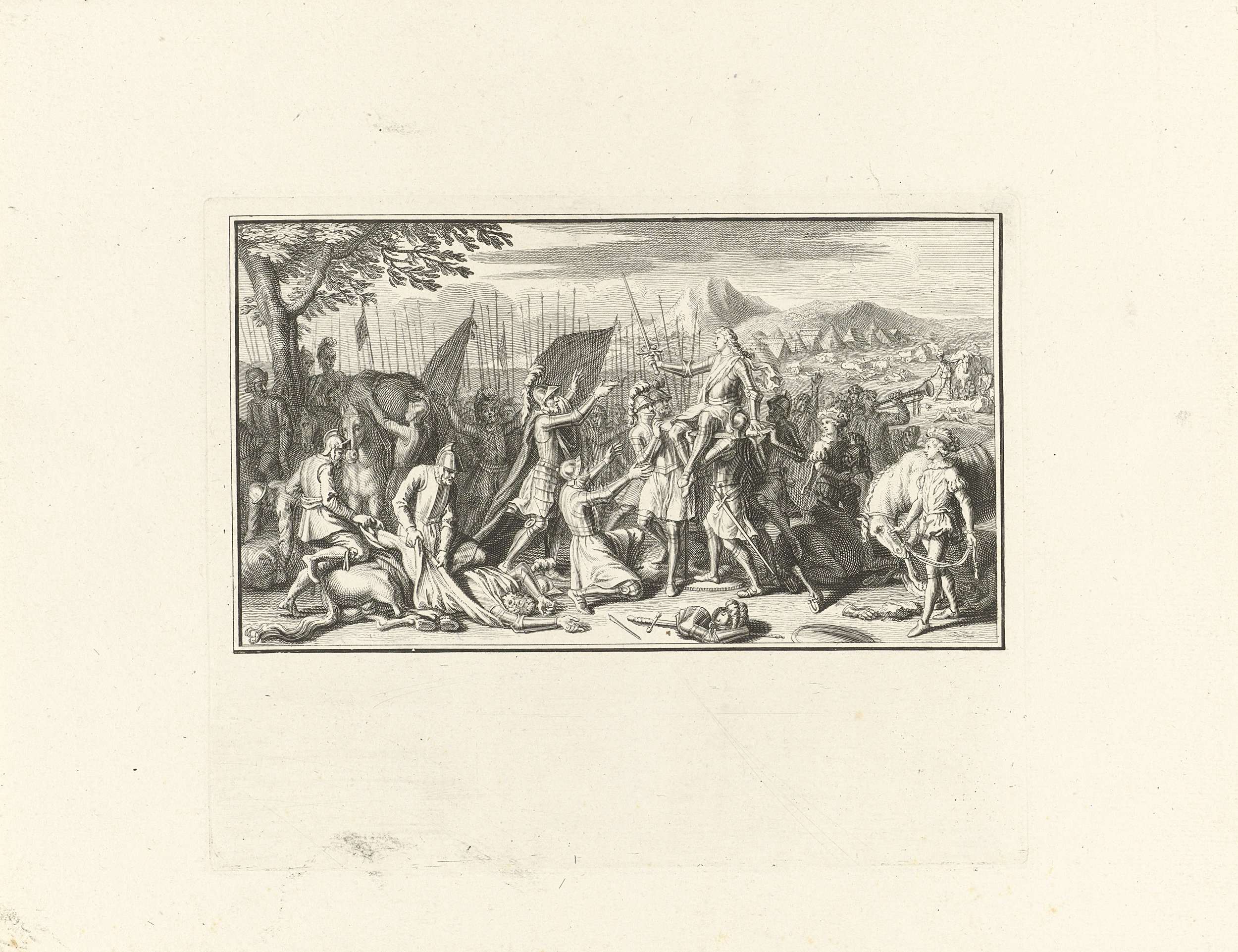 Hendrik VII verslaat Richard III tijdens de slag bij Bosworth, de laatste en beslissende slag tijdens de Rozenoorlogen in Engeland, op 22 augustus 1485. Hij wordt op het slagveld door zijn soldaten gekroond. Met een lege marge.
