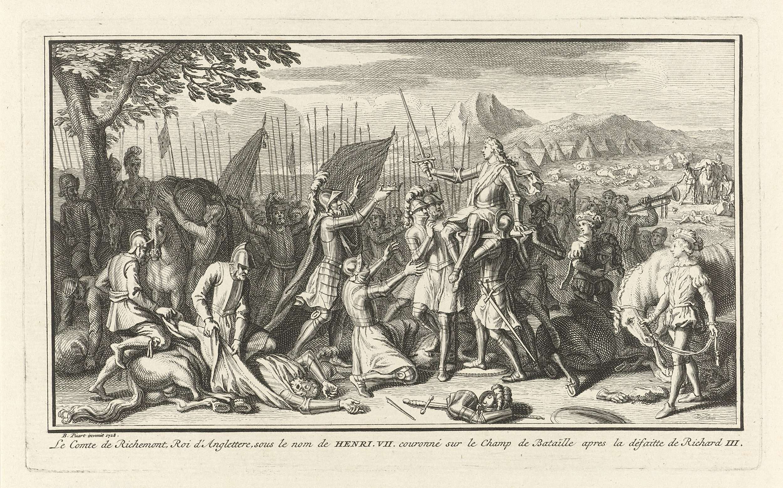 Hendrik VII verslaat Richard III tijdens de slag bij Bosworth, de laatste en beslissende slag tijdens de Rozenoorlogen in Engeland, op 22 augustus 1485. Hij wordt op het slagveld door zijn soldaten gekroond. In de marge een onderschrift in het Frans.