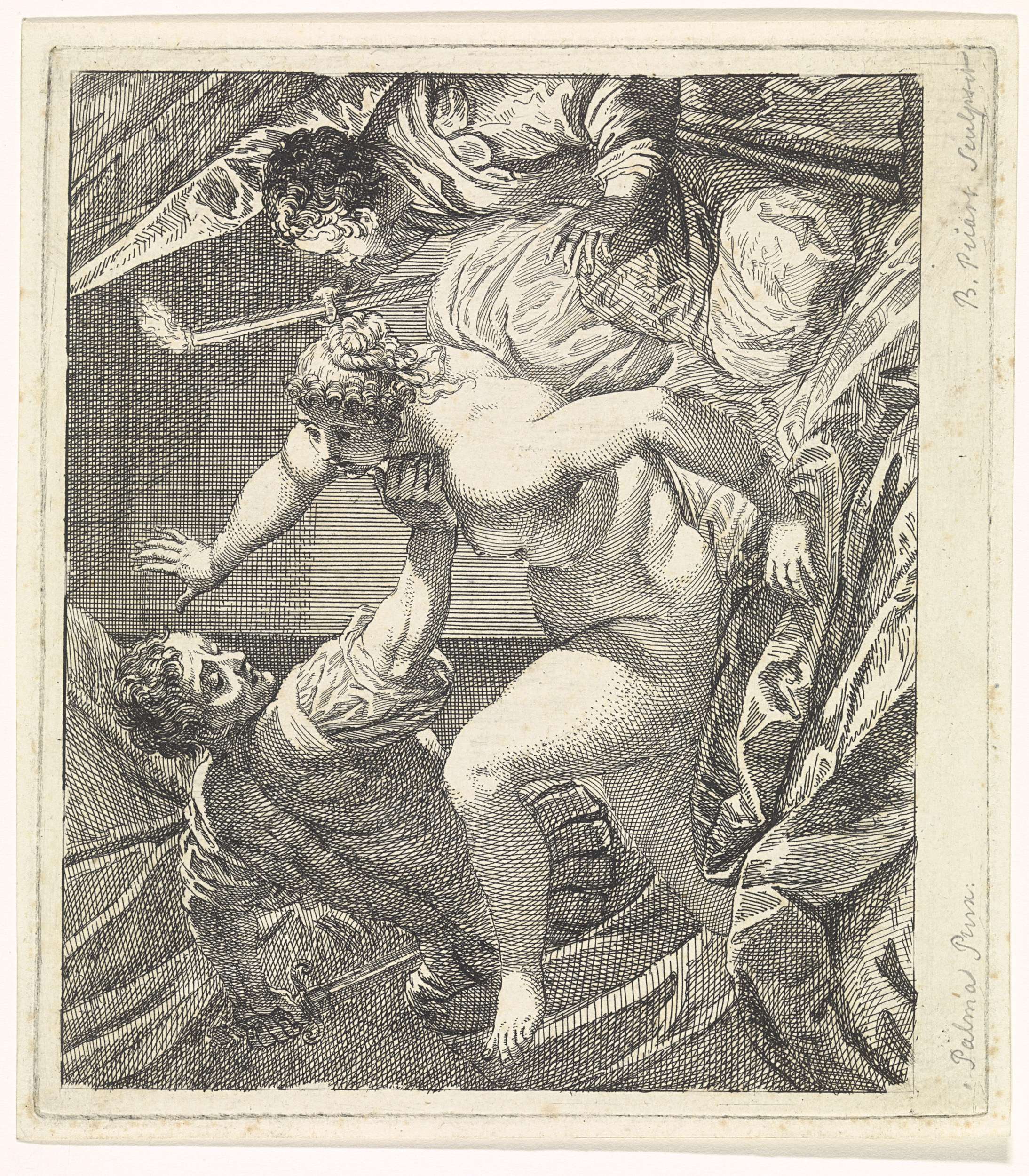Sextus Tarquinius Superbus stormt het vertrek van Lucretia binnen met getrokken zwaard. Zij is naakt en valt achterover op bed.