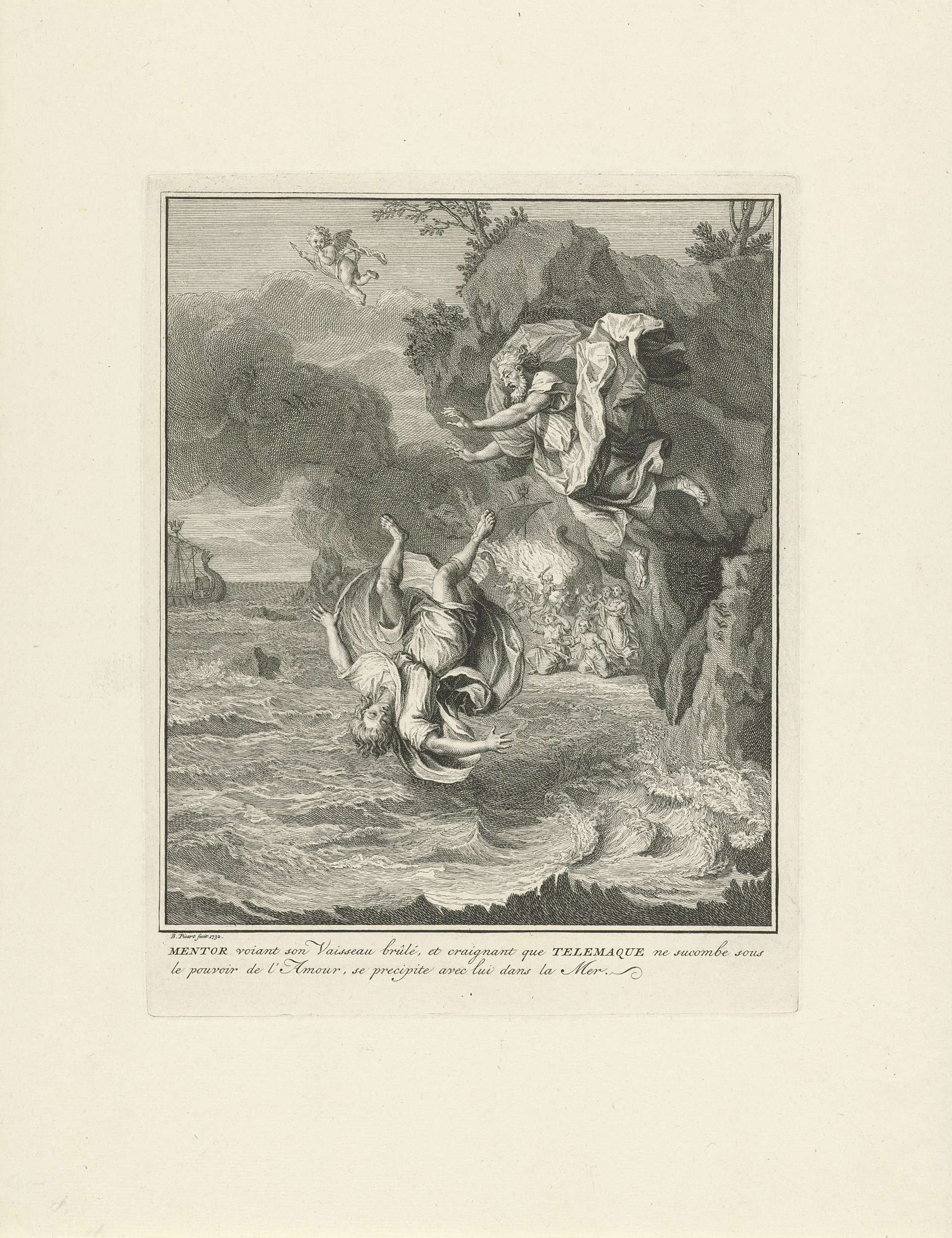 Mentor duwt Telemachus van een rots en springt hem achterna. Op de achtergrond brandt het schip dat Mentor bouwde. De nimfen kijken toe en kunnen hen niet meer tegenhouden om van het eiland te ontsnappen. In de marge een tweeregelig onderschrift in het Frans.
