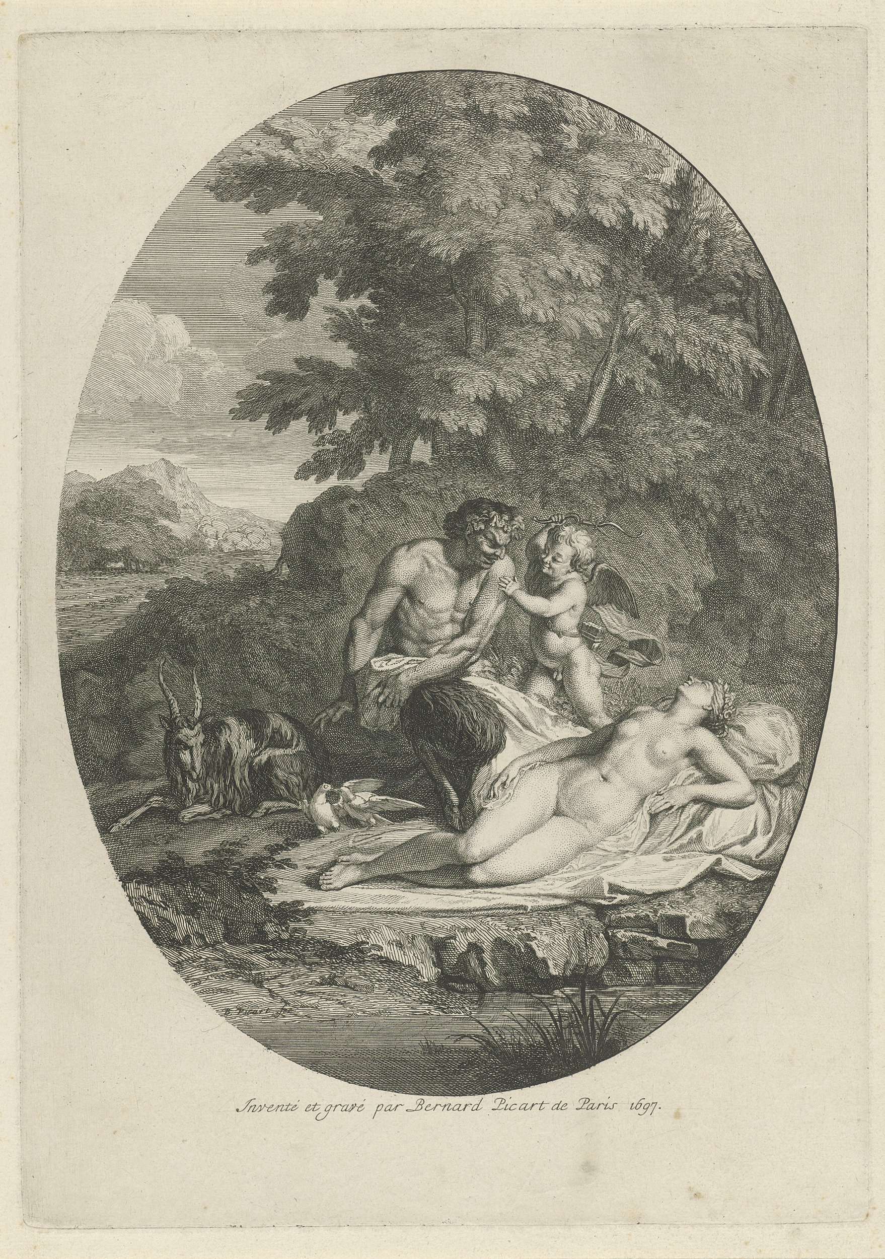Landschap met een sater die de slapende Venus besluipt. Aan haar voeten twee tortelende duiven. Amor probeert de sater tegen te houden.