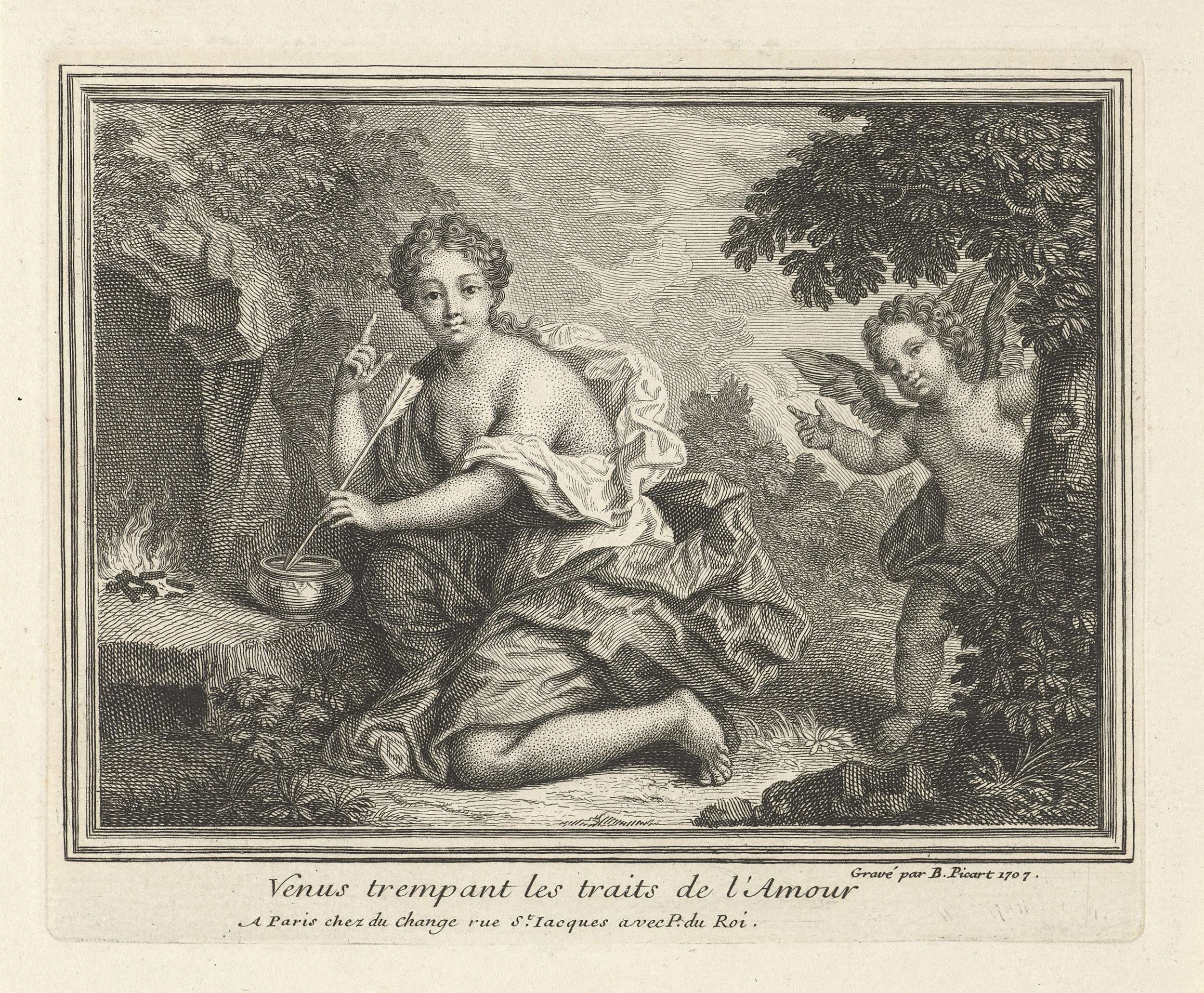 Landschap met Venus die de pijlen van Amor in een vuurpot houdt. Amor kijkt toe vanachter een boom.
