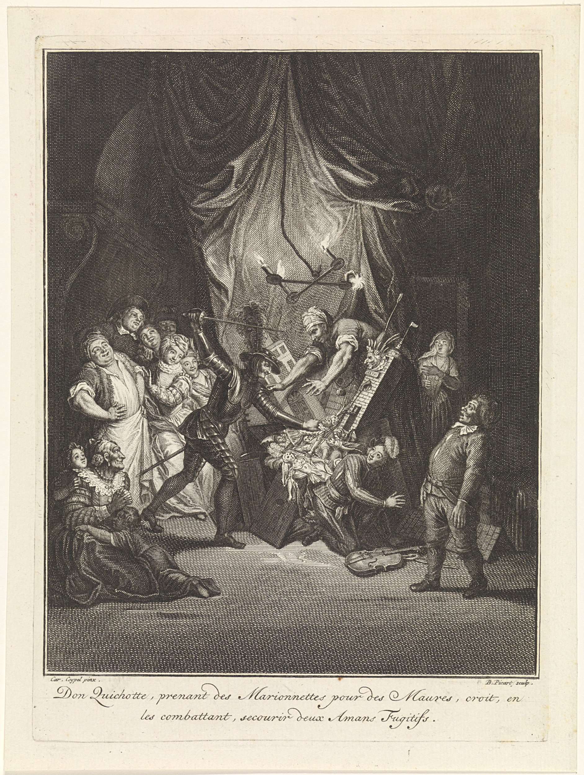 Don Quichot valt de Moorse marionetten tijdens de voorstelling aan met zijn zwaard. Het publiek kijkt lachend toe. In de marge een tweeregelig onderschrift in het Frans.