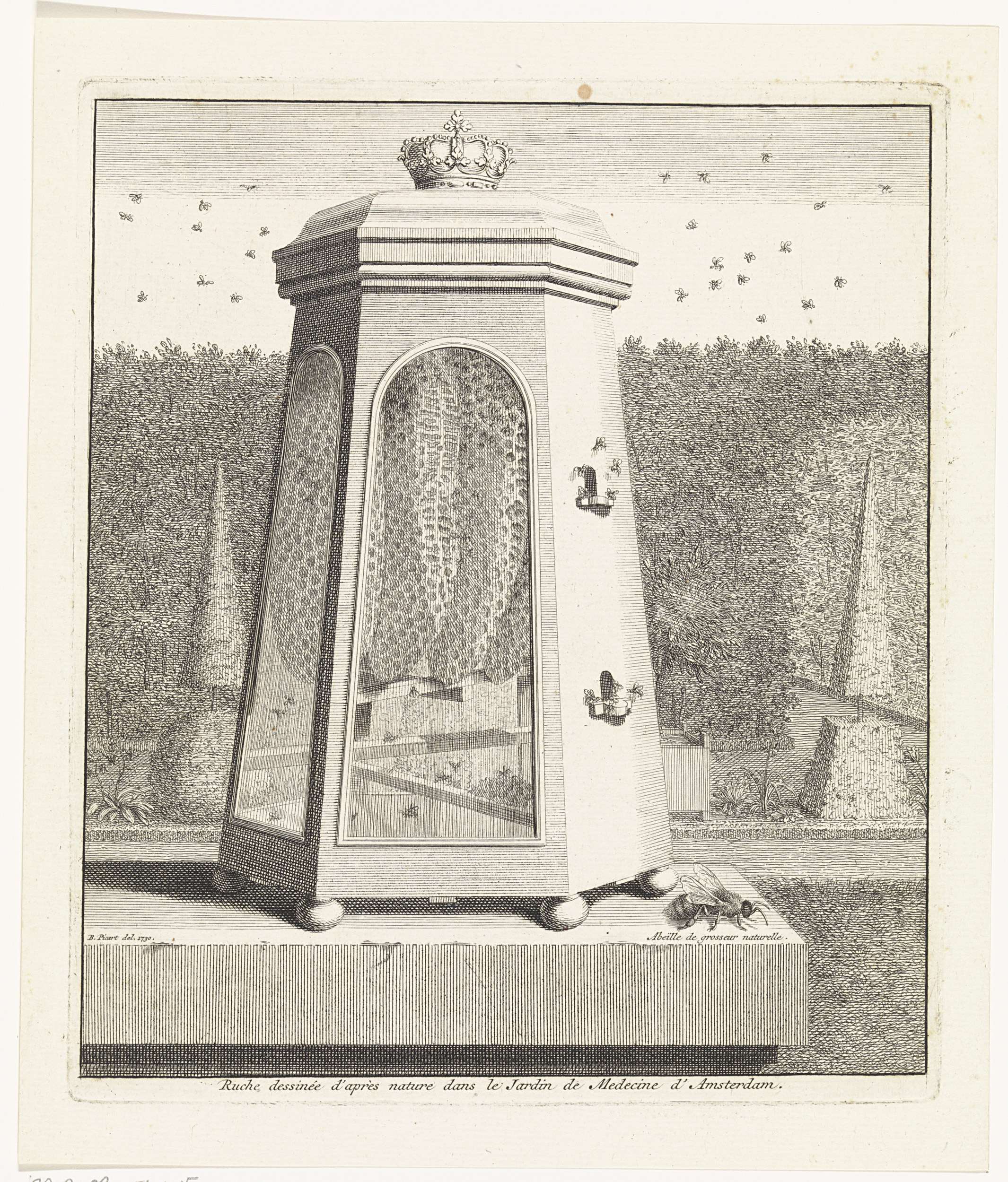 Een door mensen gemaakte bijenkorf in de medicijntuin van Amsterdam. Rechts een bij op ware grootte.