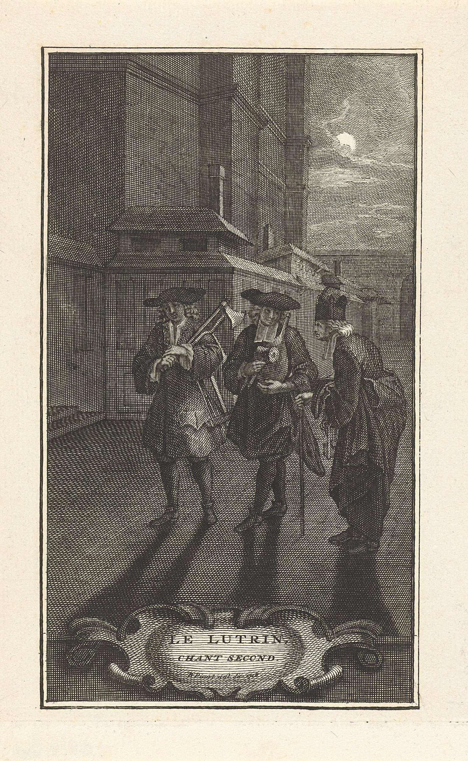 Drie mannen lopen in de nacht op straat. De pruikmaker houdt een bijl vast, Brontin een hamer en Boirude leunt op een wandelstok.