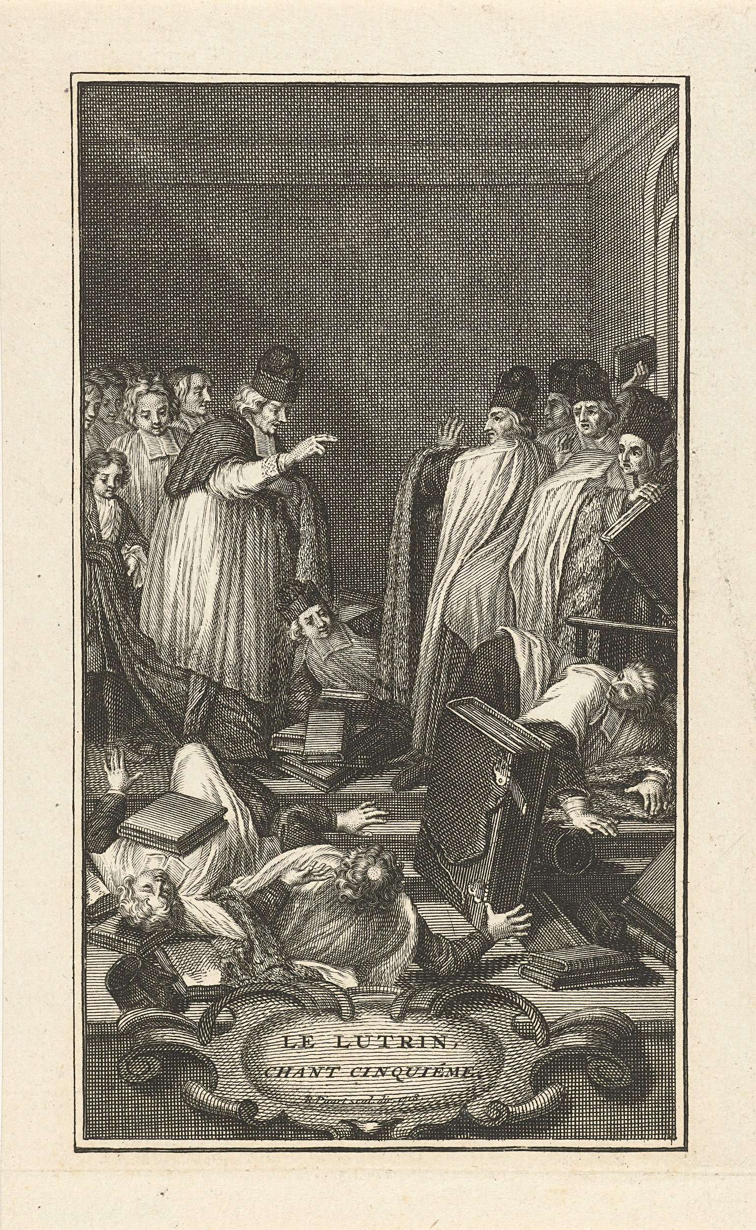 Vier priesters zijn op de grond gevallen en liggen te midden van boeken. Twee groepen geestelijken bezien het tafereel. Eén van hen spreekt de priesters toe.