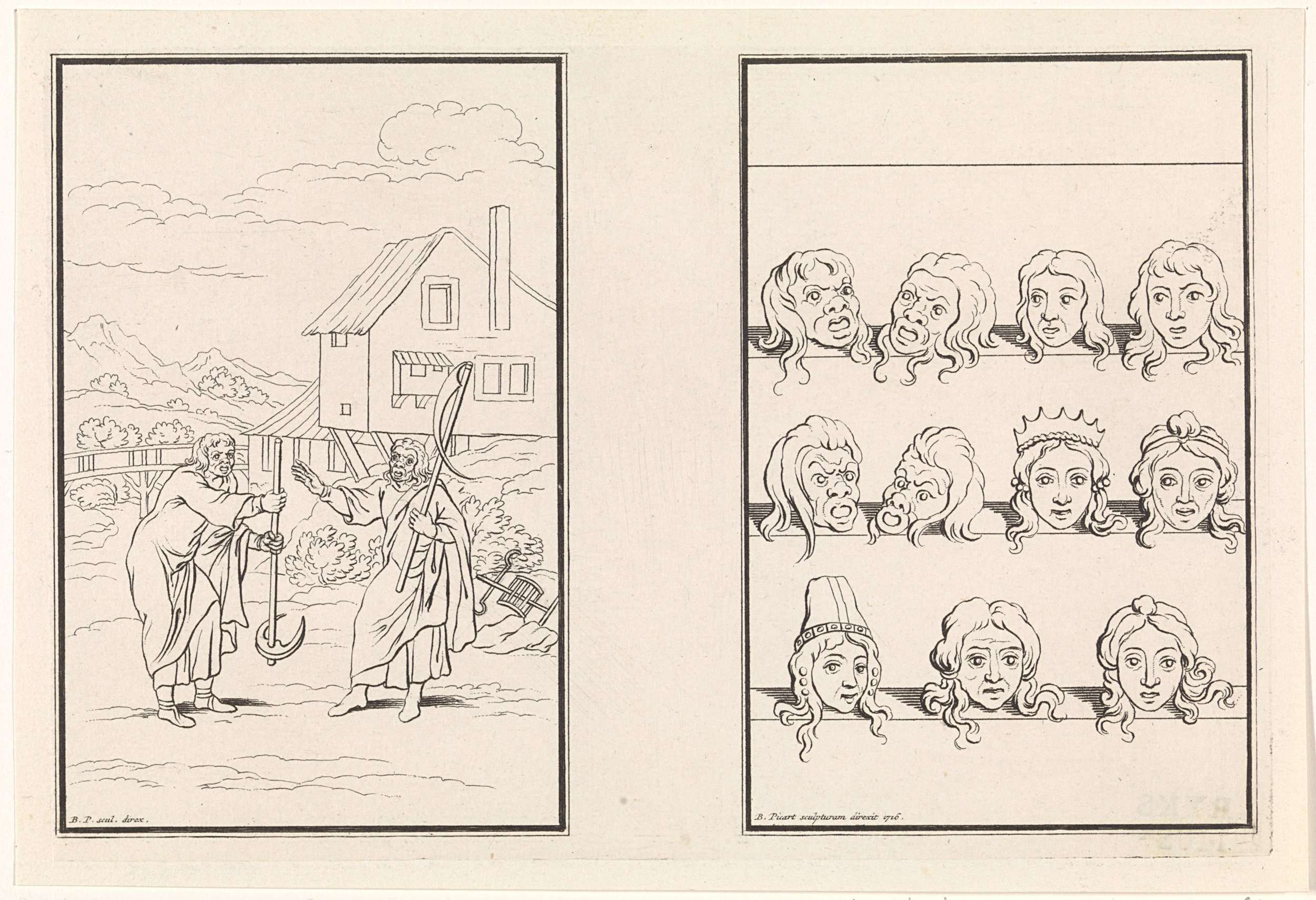 Links: Chremus en Menedemus in gesprek, een zeis in de hand. Rechts: Maskers van personages uit de komedie Heauton Timorumenos van Terentius.