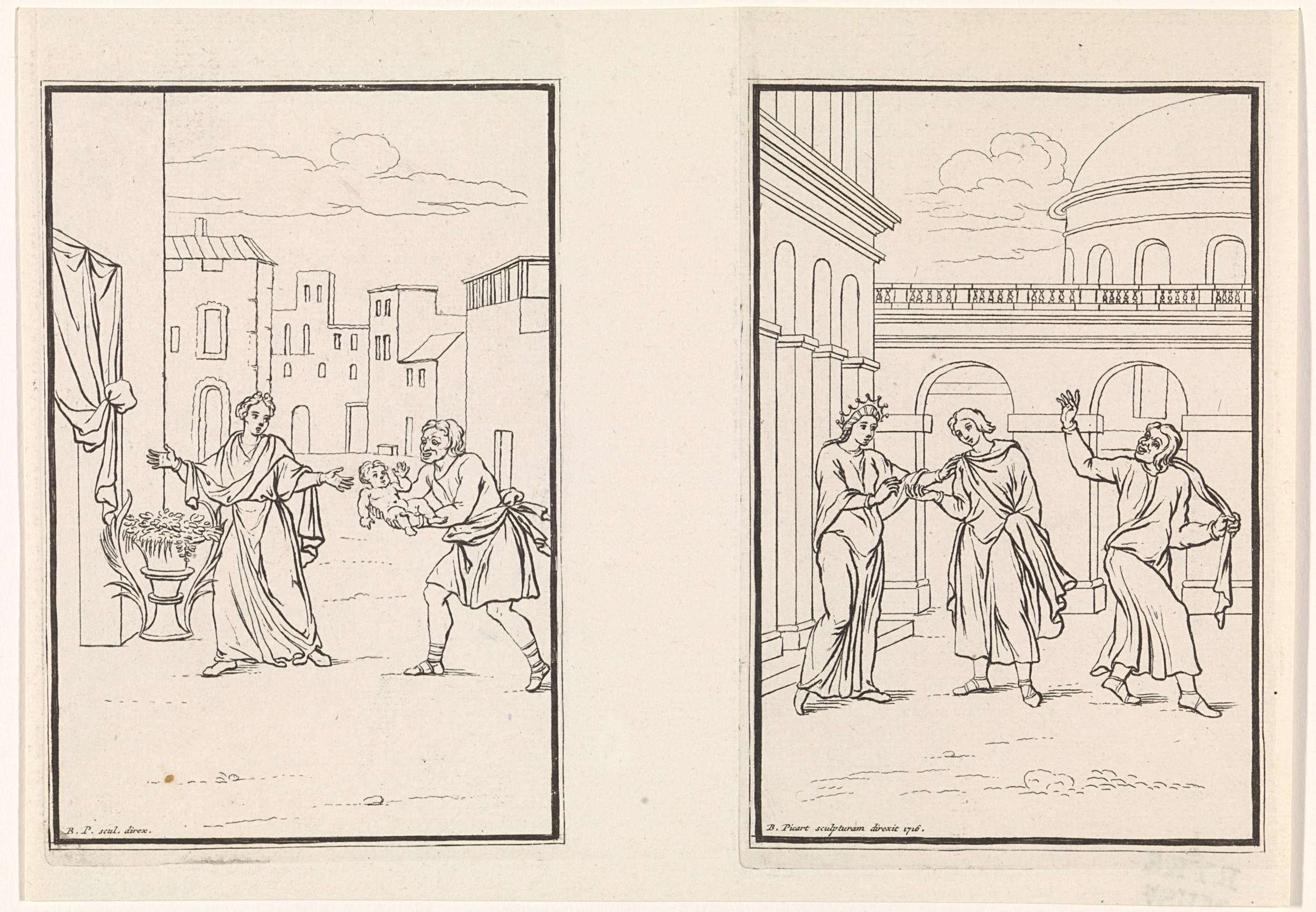 Links: Davus houdt de baby in zijn armen en volgt Mysus het huis in. Rechts: Parmeno zwaait naar Thais en Phaedria.