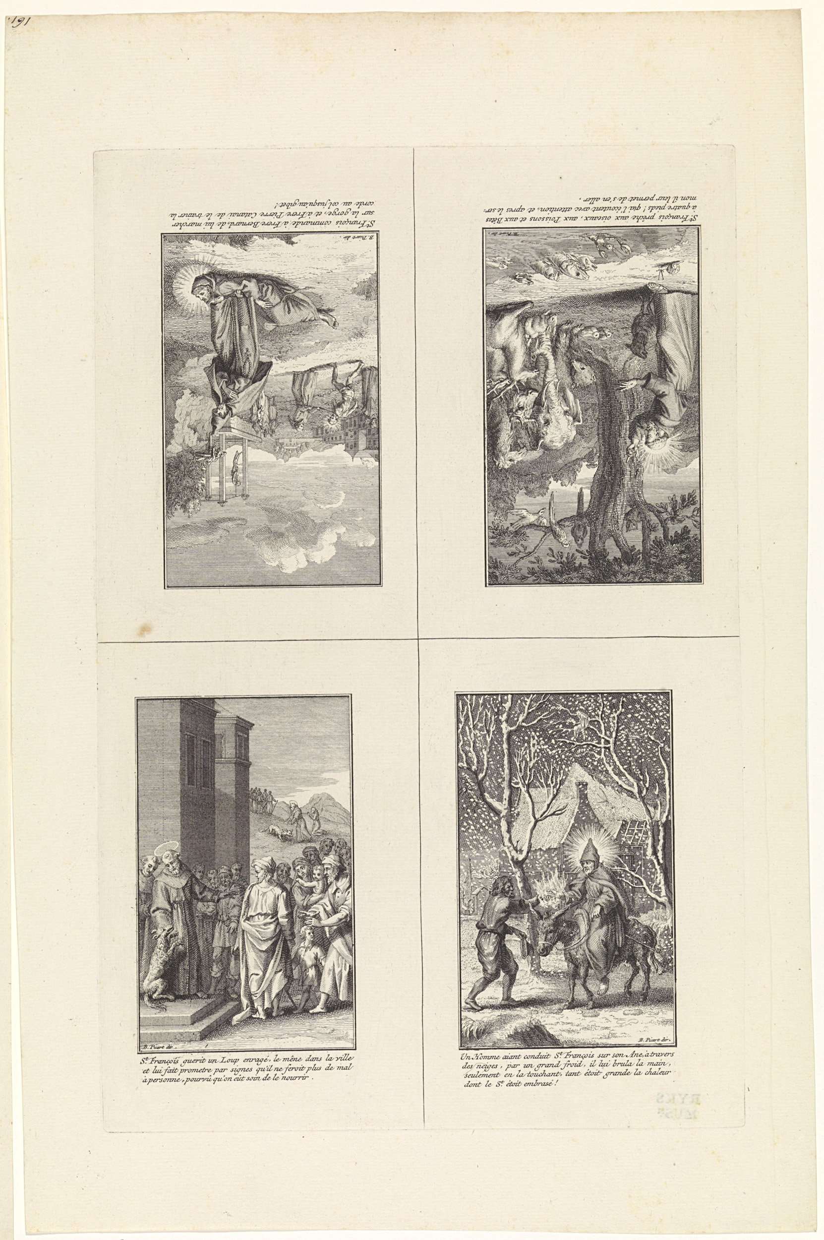 Blad met vier boekillustraties die scènes uit het leven van de H. Franciscus van Assisi verbeelden. Respectievelijk: Franciscus ligt op de weg en vraagt een monnik over zijn keel te lopen; op de achtergrond wordt hij naar de galg geleid, Franciscus preekt tot de dieren en vogels, Franciscus temt de wolf van Gubbio en een ...
