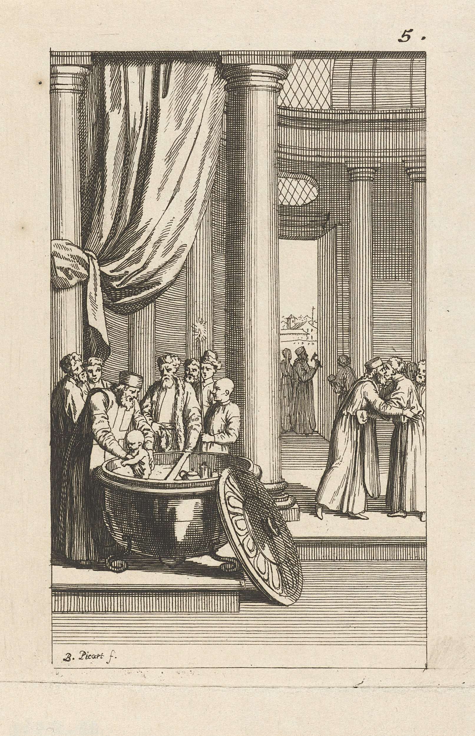 De priester houdt het kind in het doopvont. Omstanders kijken toe.