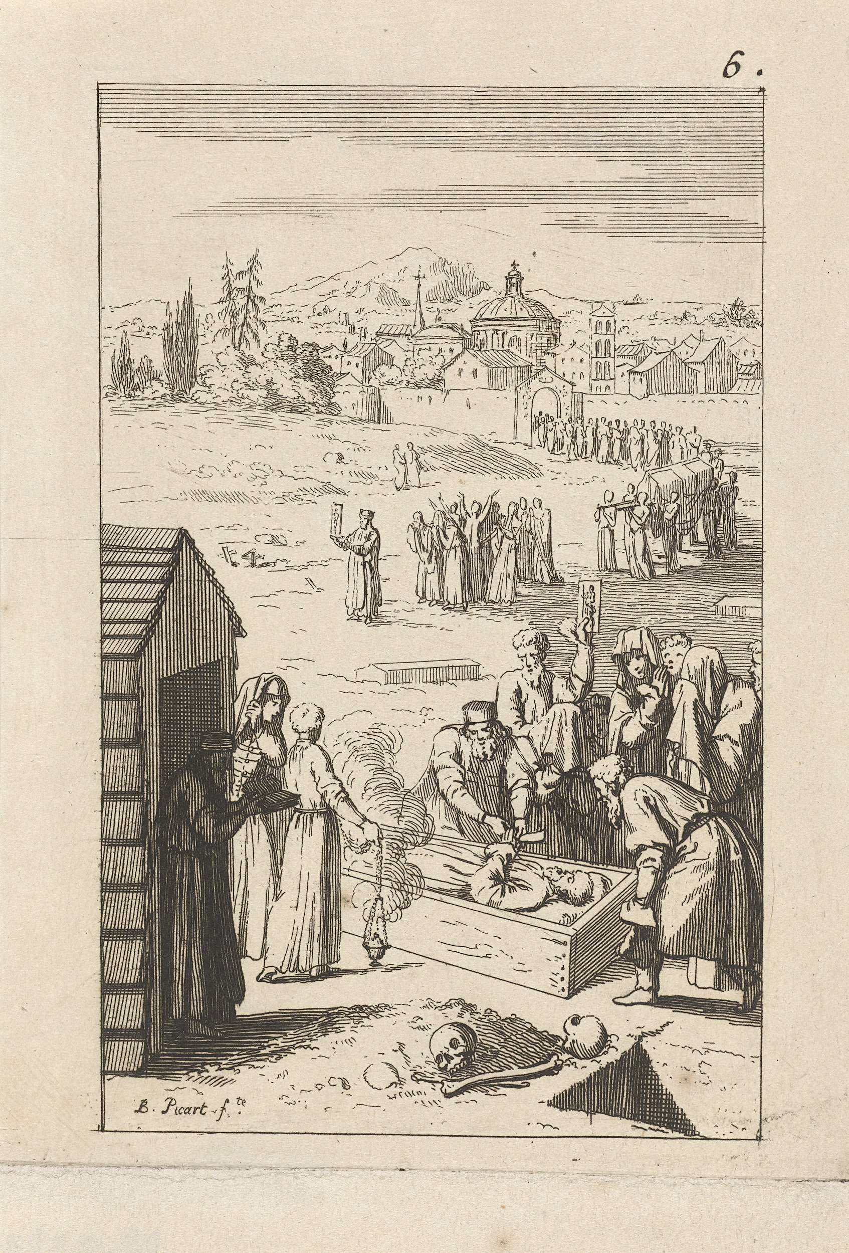 Landschap met op de voorgrond de begrafenis van een geestelijke. De man ligt in zijn kist en de priester leest voor uit de bijbel. Op de achtergrond een begrafenisstoet die vanuit de stad met een kist op weg is naar de begraafplaats.