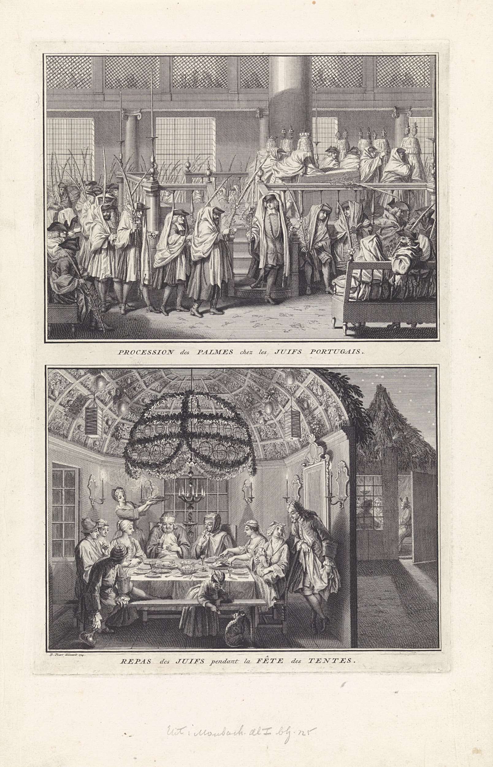 Blad met twee voorstellingen van joodse gebruiken tijdens de viering van Soekot of het Loofhuttenfeest. Boven: In de Portugese Synagoge te Amsterdam wordt een processie rond het podium met de lessenaar gehouden, waarbij de mannen in de ene hand verschillende takken houden en in de andere hand een vrucht, de etroch. Op het podium staan ...