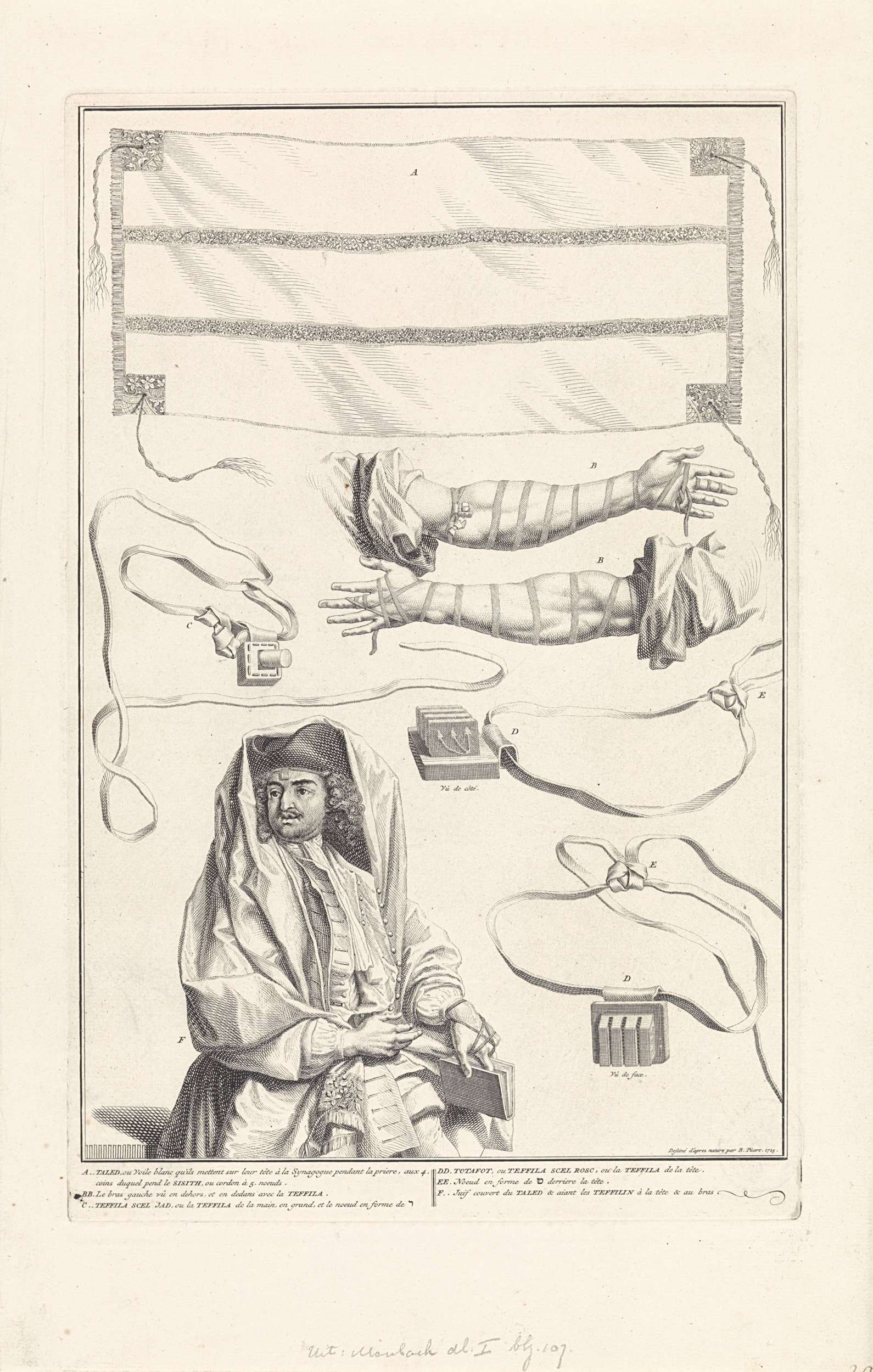 Bovenaan een Joods gebedskleed, de zogeheten talliet. Daaronder gebedsriemen, de tefilin. Linksonder een man met het gebedskleed over het hoofd en de schouders en gebedsriemen om de armen. Onderaan in de marge een toelichting in het Frans.