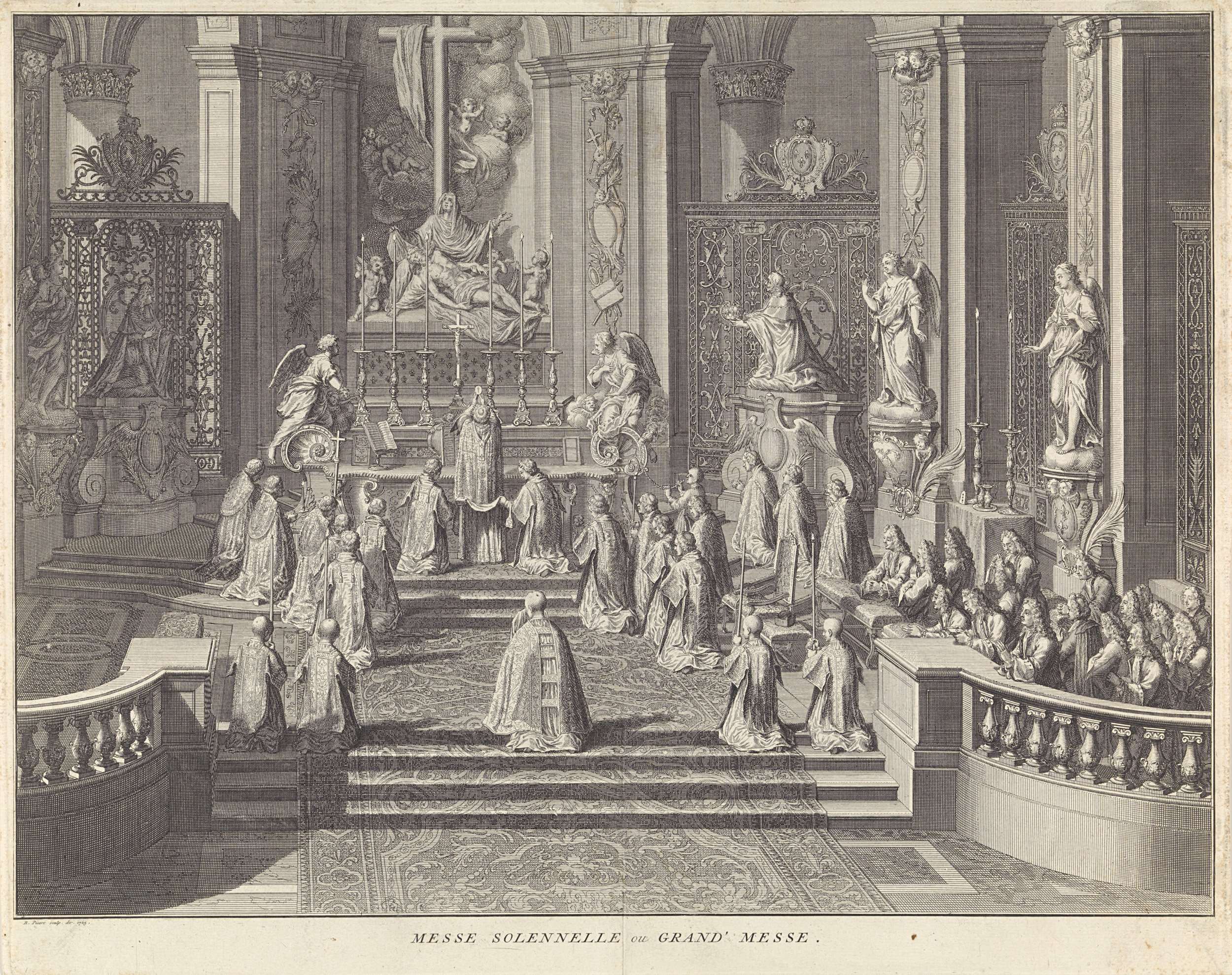 De rooms-katholieke hoogmis of plechtige mis, zoals deze wordt gezongen en gehouden op zon- en feestdagen. De bisschop heft voor het altaar de hostie op. De andere kerkelijke hoogwaardigheidsbekleders en aanwezige gelovigen knielen.