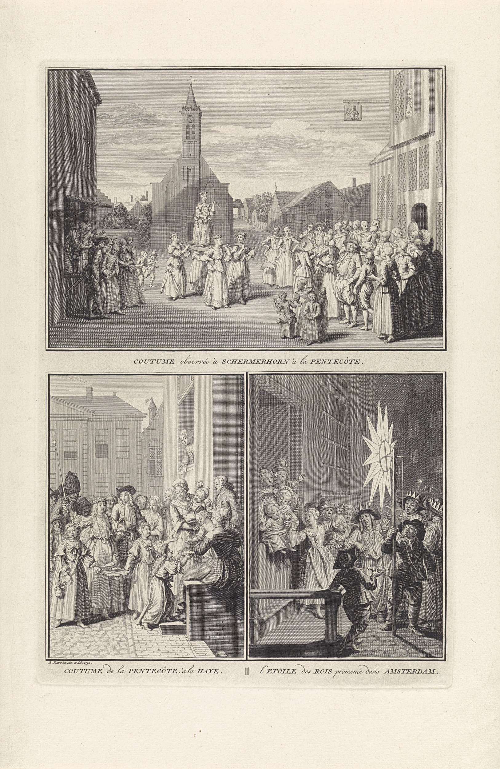 Blad met drie voorstellingen met gebruiken rond Pinksteren en Driekoningen. Boven: op Pinksteren in Schermerhorn wordt een meisje (de Pinksterblom of Pinksterbruid) door vier andere meisjes rondgedragen. Linksonder: in Den Haag gaan met Pinksteren met bloemen versierde meisjes langs de deuren om geld op te halen. Rechtsonder: op Driekoningenavond in Amsterdam gaan mensen zingend langs ...