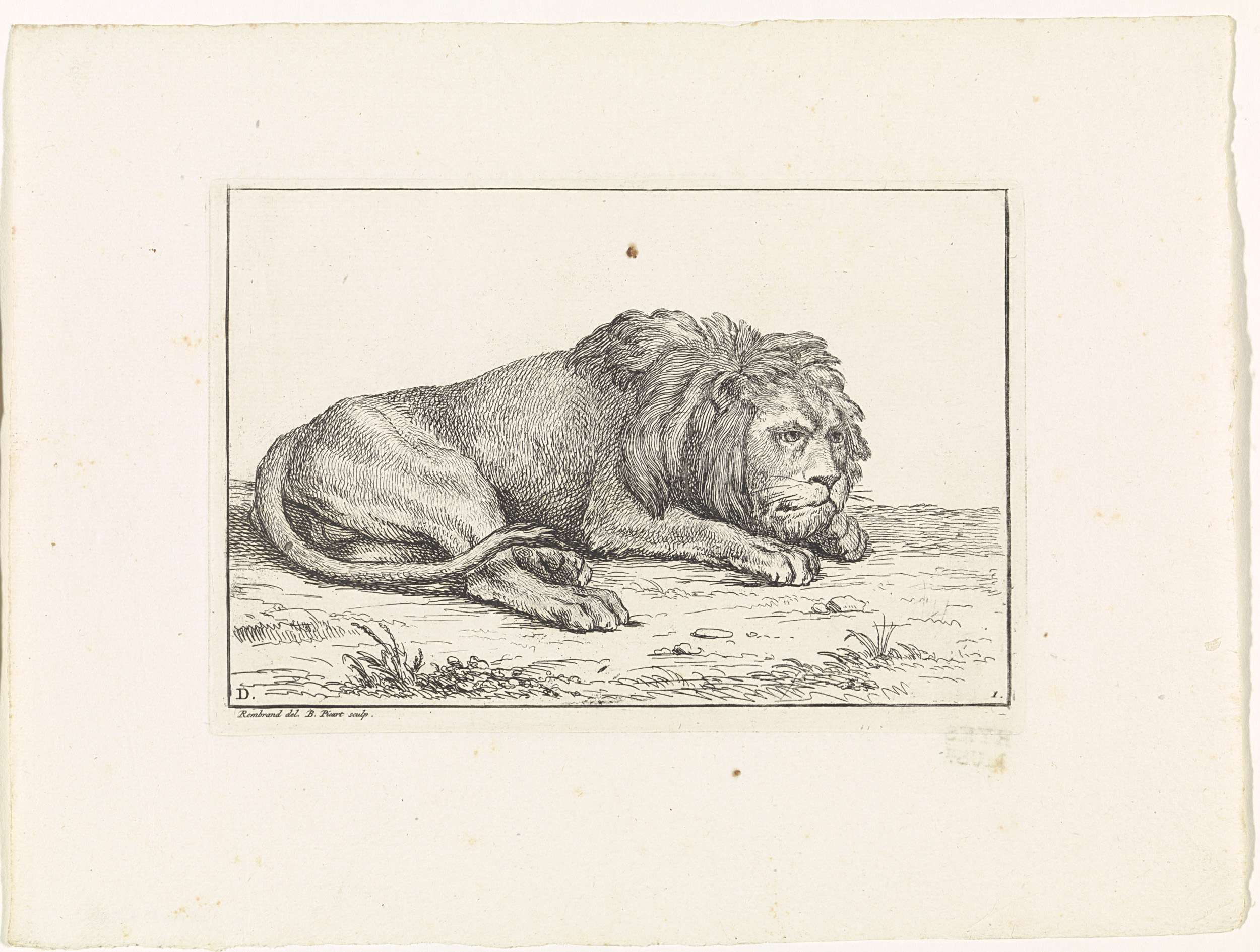 Een leeuw ligt op het gras. Gemerkt linksonder: D. Genummerd rechtsonder: 1.
