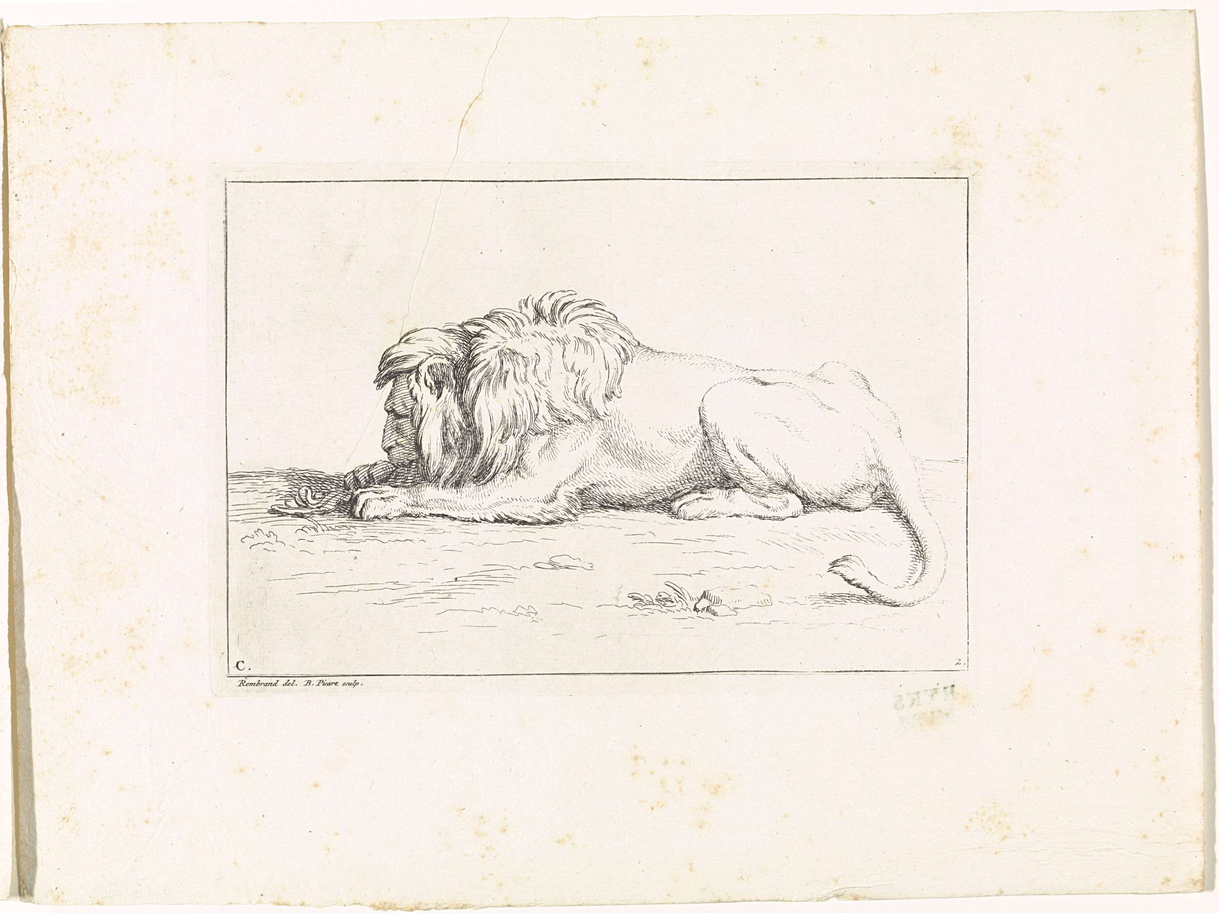 Een leeuw ligt op het gras, hij kauwt ergens op. Gemerkt linksonder: C. Genummerd rechtsonder: 2.