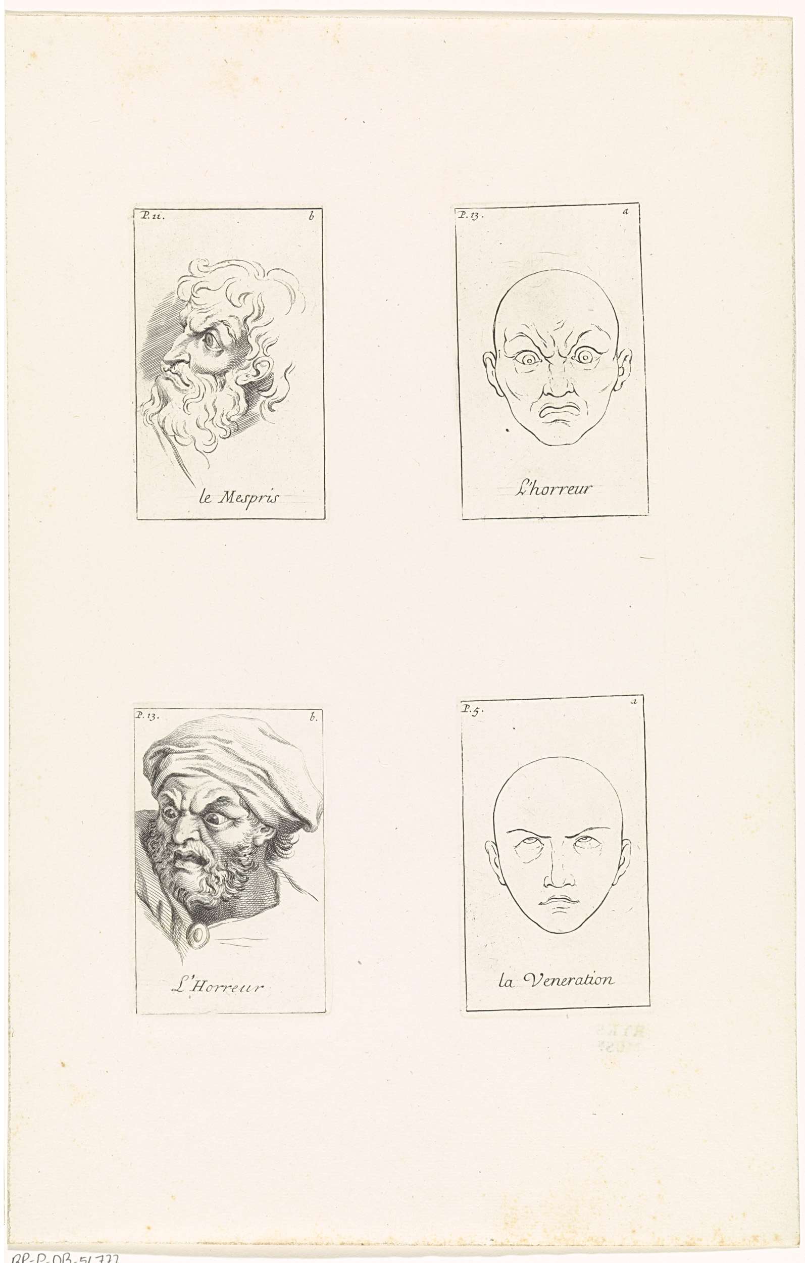 Onversneden blad met vier prenten met voorstellingen van mannenkoppen die verschillende emoties uitdrukken. Van links naar rechts, van boven naar beneden: le Mespris, l'horreur, L'Horreur en la Veneration. De prenten hebben een titel in het Frans en zijn gemerkt met een paginanummer en een letter.