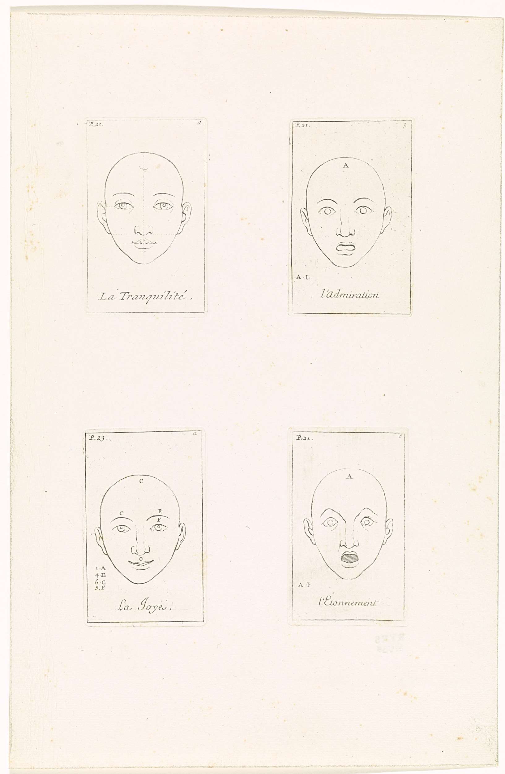 Onversneden blad met vier prenten met voorstellingen van koppen die verschillende emoties uitdrukken. Van links naar rechts, van boven naar beneden: La Tranquilité, l'Admiration, La Joye, l'Étonnement. De prenten hebben een titel in het Frans en zijn gemerkt met een paginanummer en een letter.