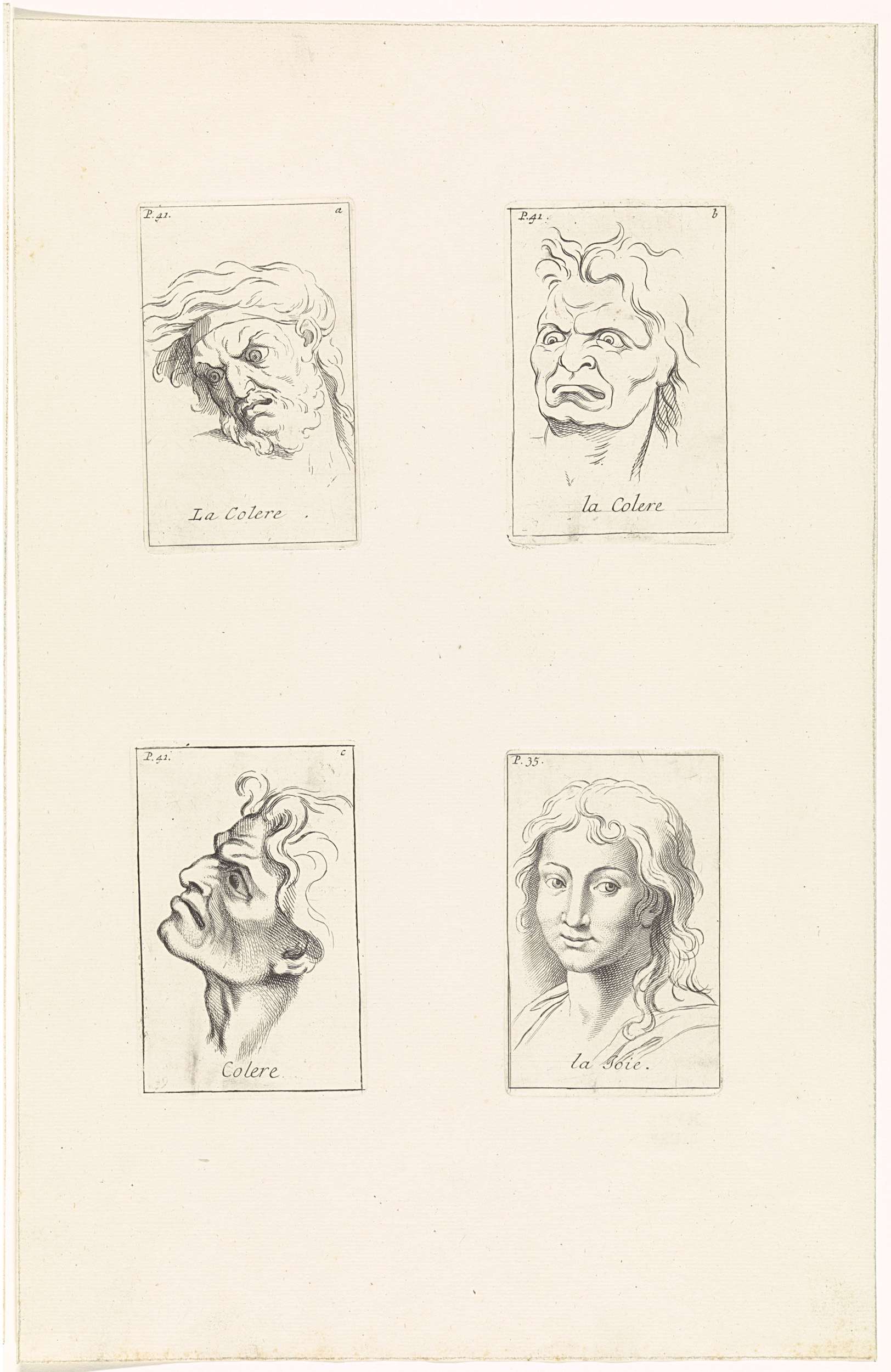 Onversneden blad met vier prenten met voorstellingen van mannenkoppen die verschillende emoties uitdrukken. Van links naar rechts, van boven naar beneden: La Colere, la Colere, Colere, la Joie. De prenten hebben een titel in het Frans en zijn gemerkt met een paginanummer en een letter.