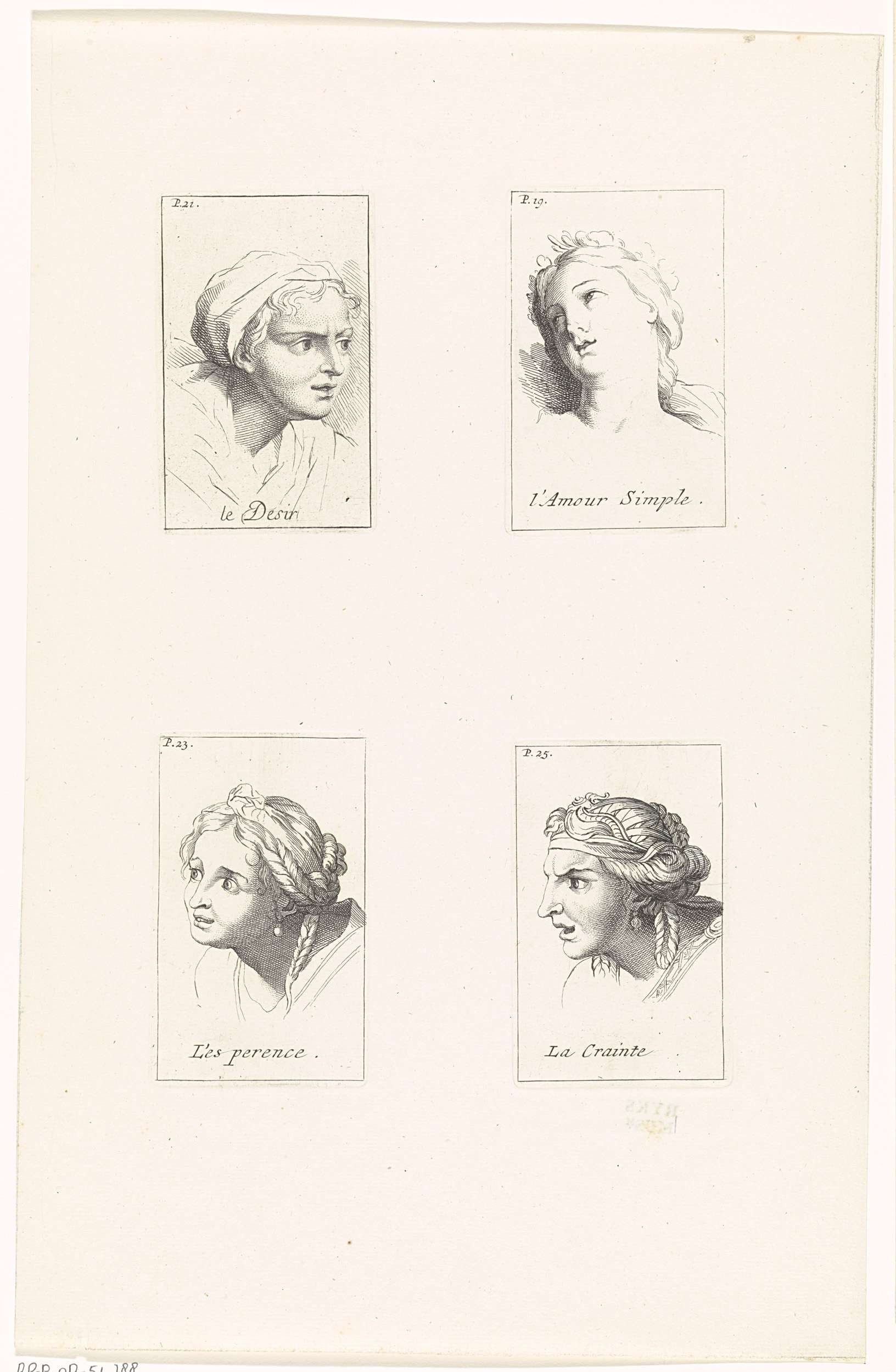 Onversneden blad met vier prenten met voorstellingen van vrouwenkoppen die verschillende emoties uitdrukken. Van links naar rechts, van boven naar beneden: le Desir, l'Amour Simple, L'es perence, La Crainte. De prenten hebben een titel in het Frans en zijn gemerkt met een paginanummer.