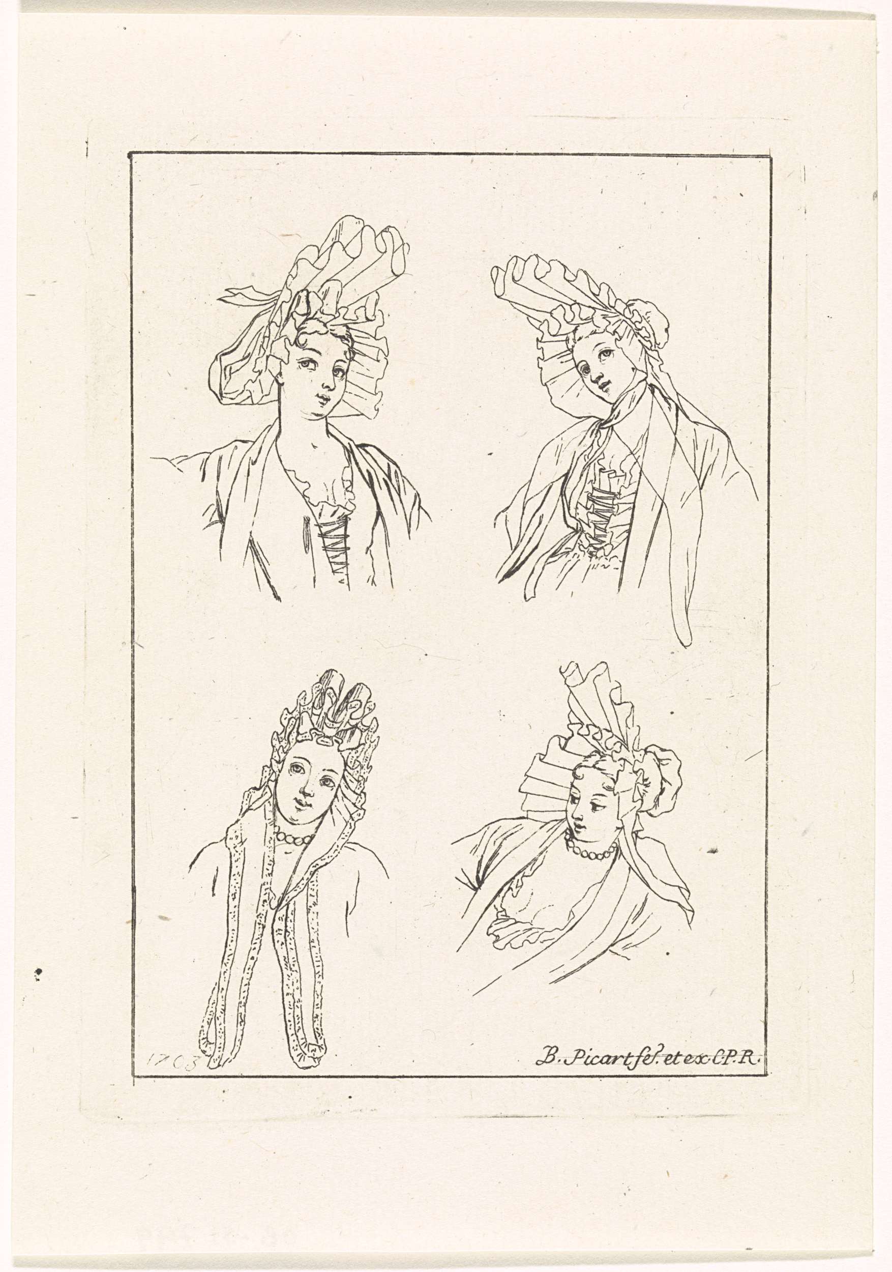 Allerlei houdingen van vrouwenhoofden en manieren om het fontangekapsel te dragen