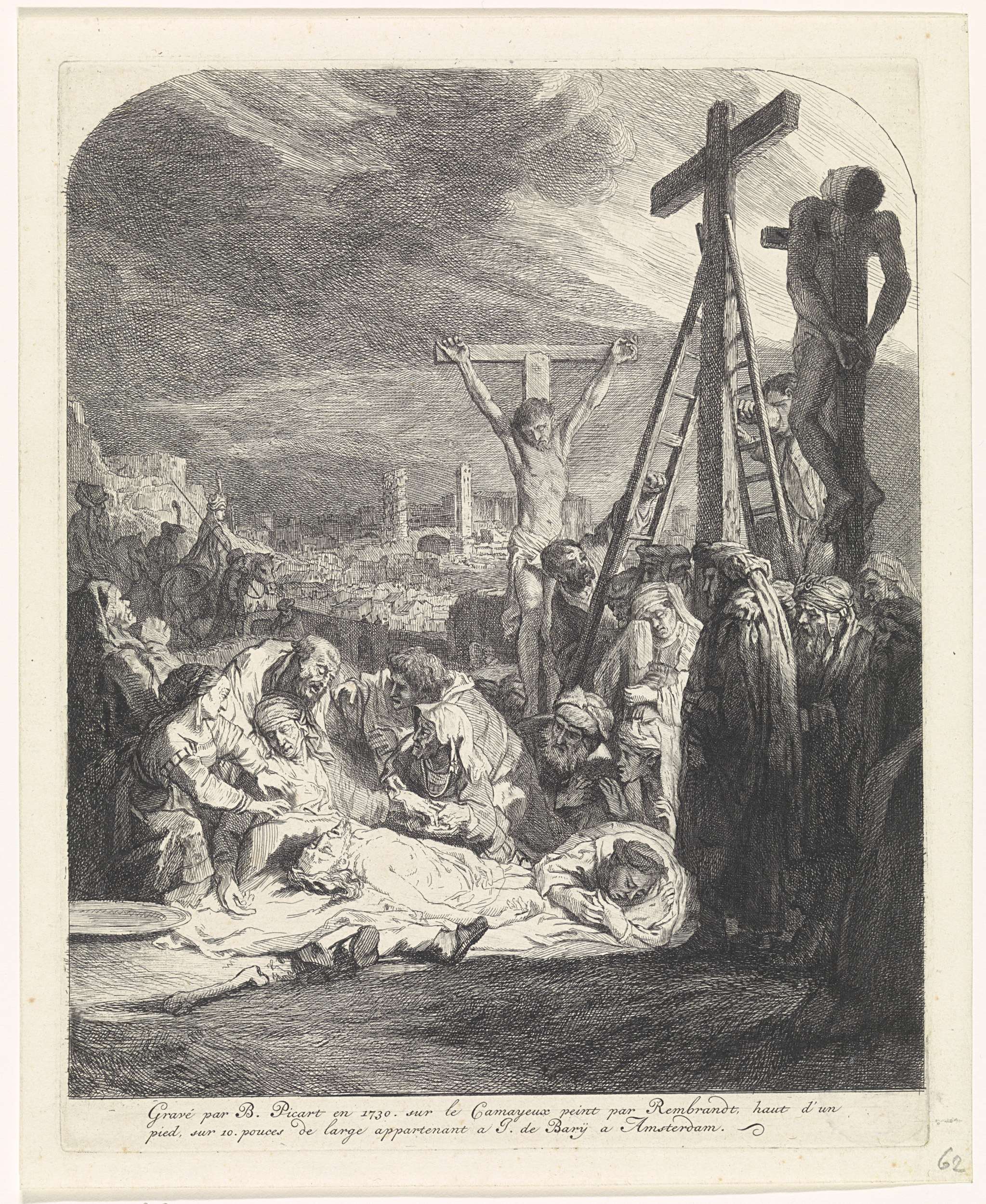 Maria en anderen treuren bij het lichaam van Christus dat op een doek ligt. De twee misdadigers hangen nog aan hun kruis. In de marge een tweeregelig onderschrift in het Frans.