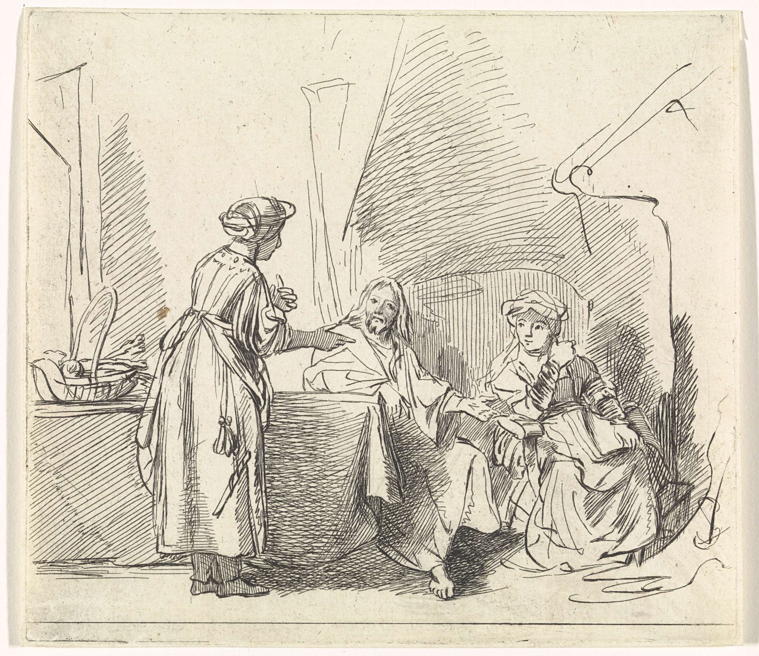 Christus is te gast in het huis van de zussen Marta en Maria. Maria zit aan tafel met Christus en luistert naar hem. Bij hen staat de vlijtige Marta, die haar zuster Maria berispt.