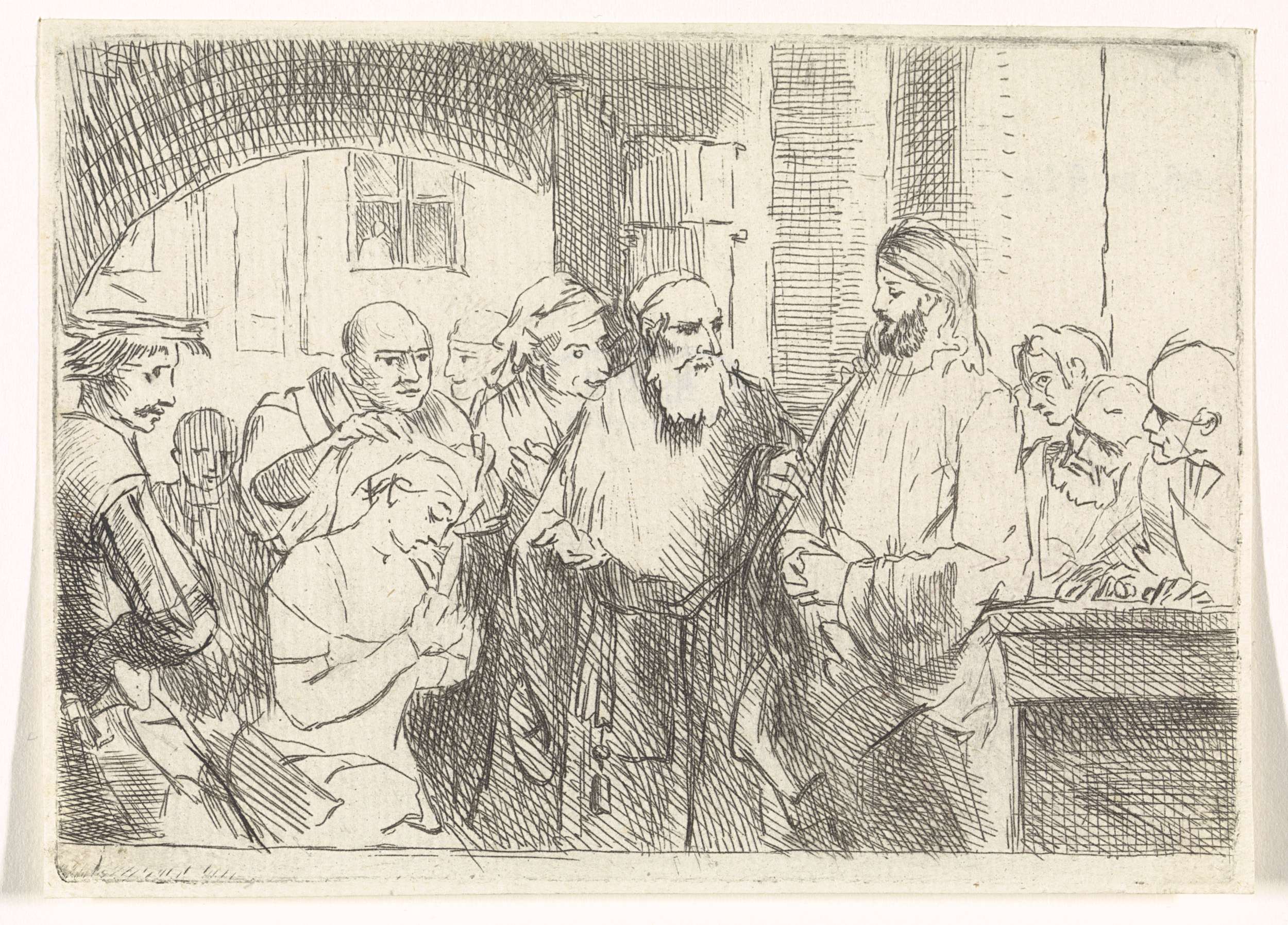 De Farizeeën brengen een overspelige vrouw naar Christus om hem te laten oordelen over haar vergrijp. De vrouw knielt voor Christus. De priester staat tussen hen in, omstanders kijken toe.