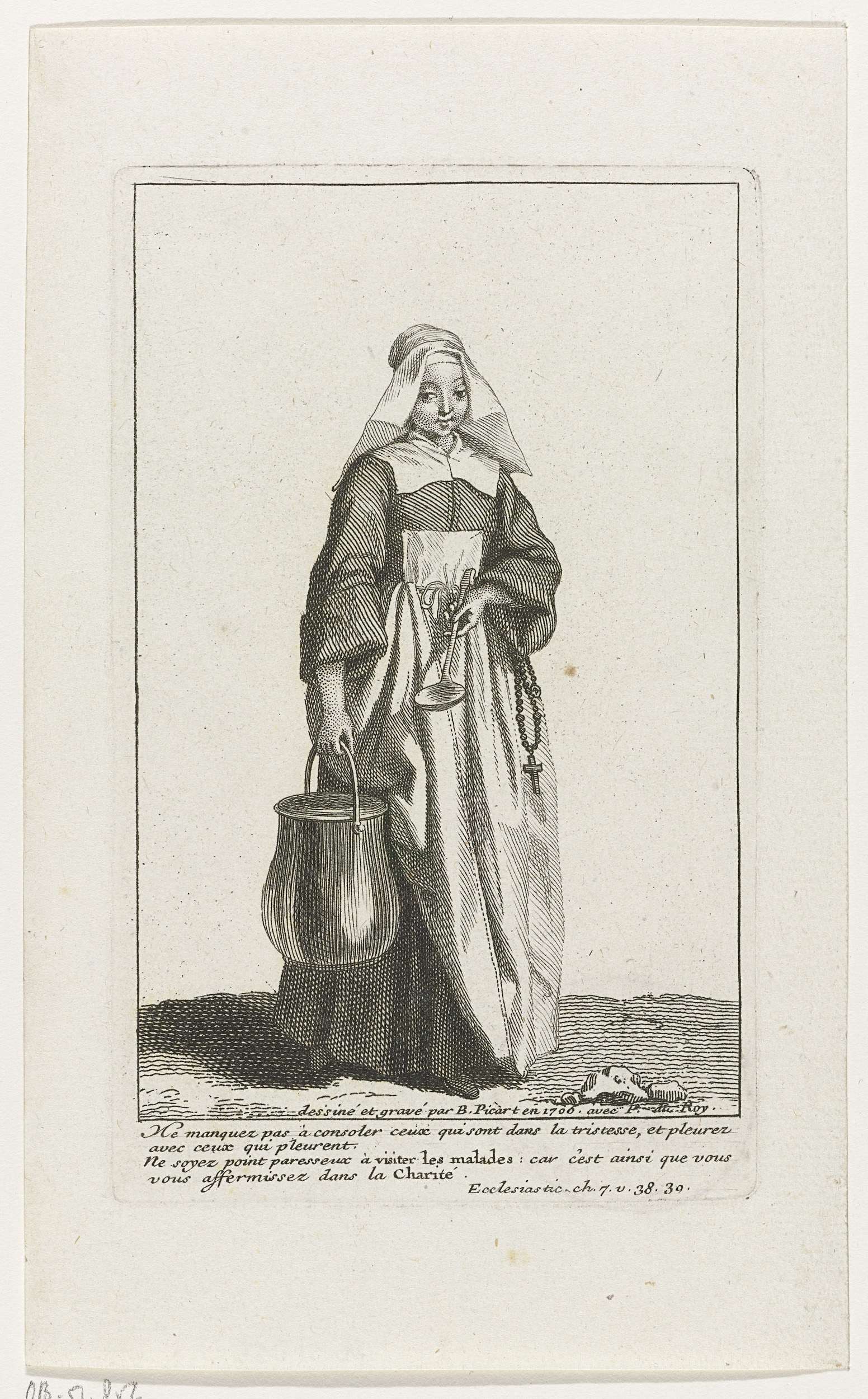 Non in eigentijds kostuum, langs haar zij hangt een rozenkrans. In de marge een vierregelig Bijbelcitaat in het Frans.