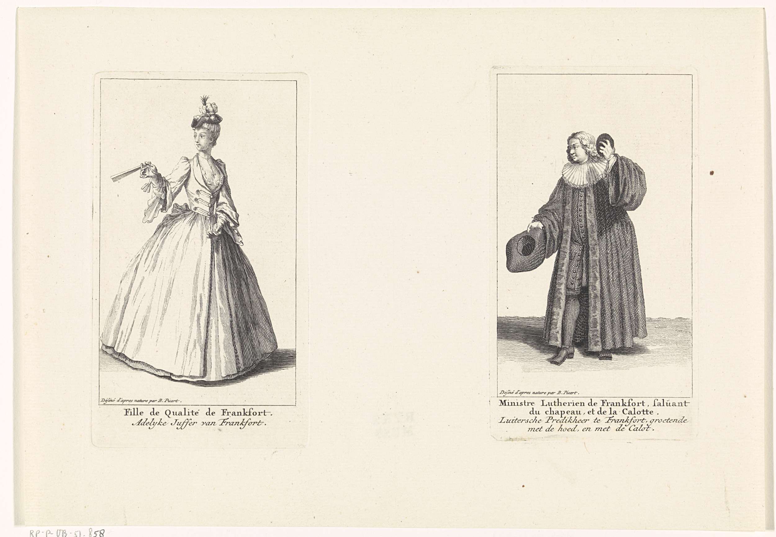 Niet versneden blad met twee prenten met voorstellingen van figuren in klederdracht. Een dame van stand uit Frankfurt, gekleed volgens de mode van ca. 1728. Een Lutherse dominee uit Frankfurt, gekleed in lange mantel waaroverheen een brede geplooide kraag. De prenten hebben een titel in het Frans en in het Nederlands.