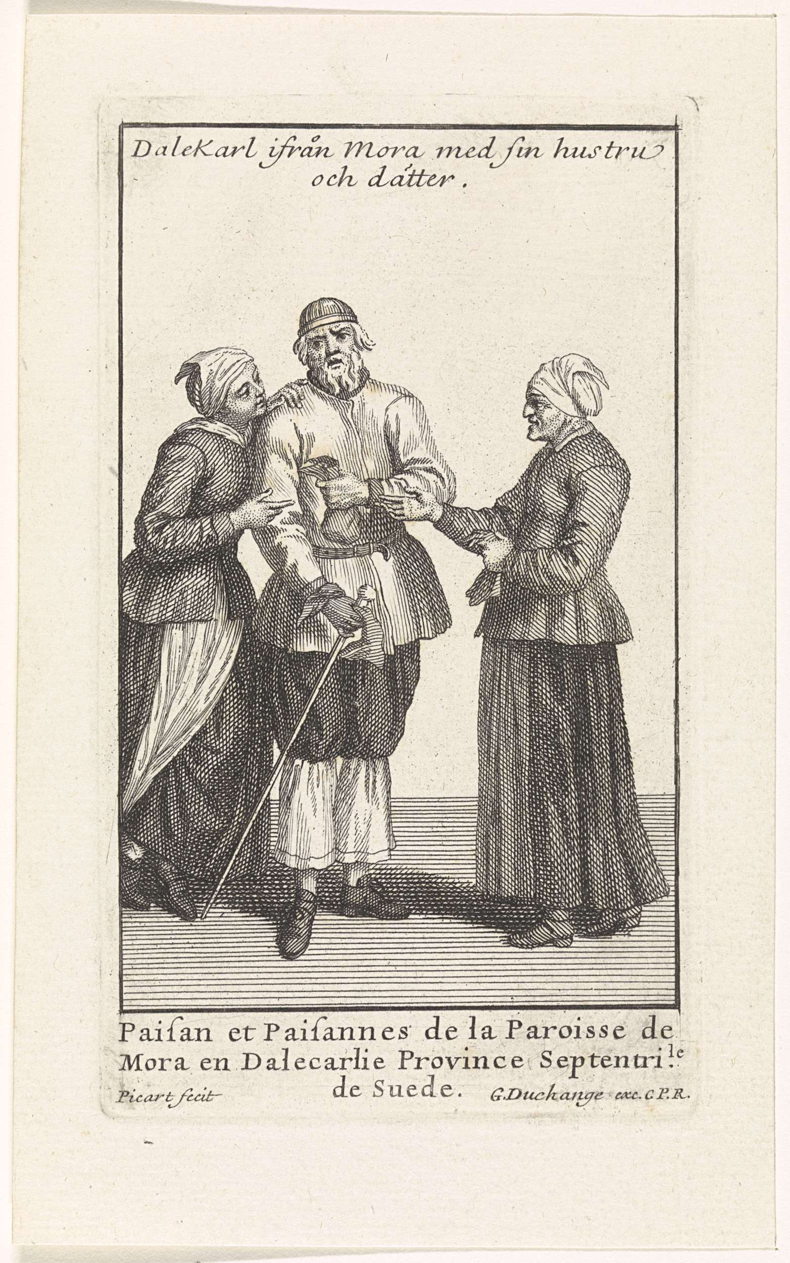 Figuren in klederdracht. De prent heeft een titel in het Zweeds en een onderschrift in het Frans.