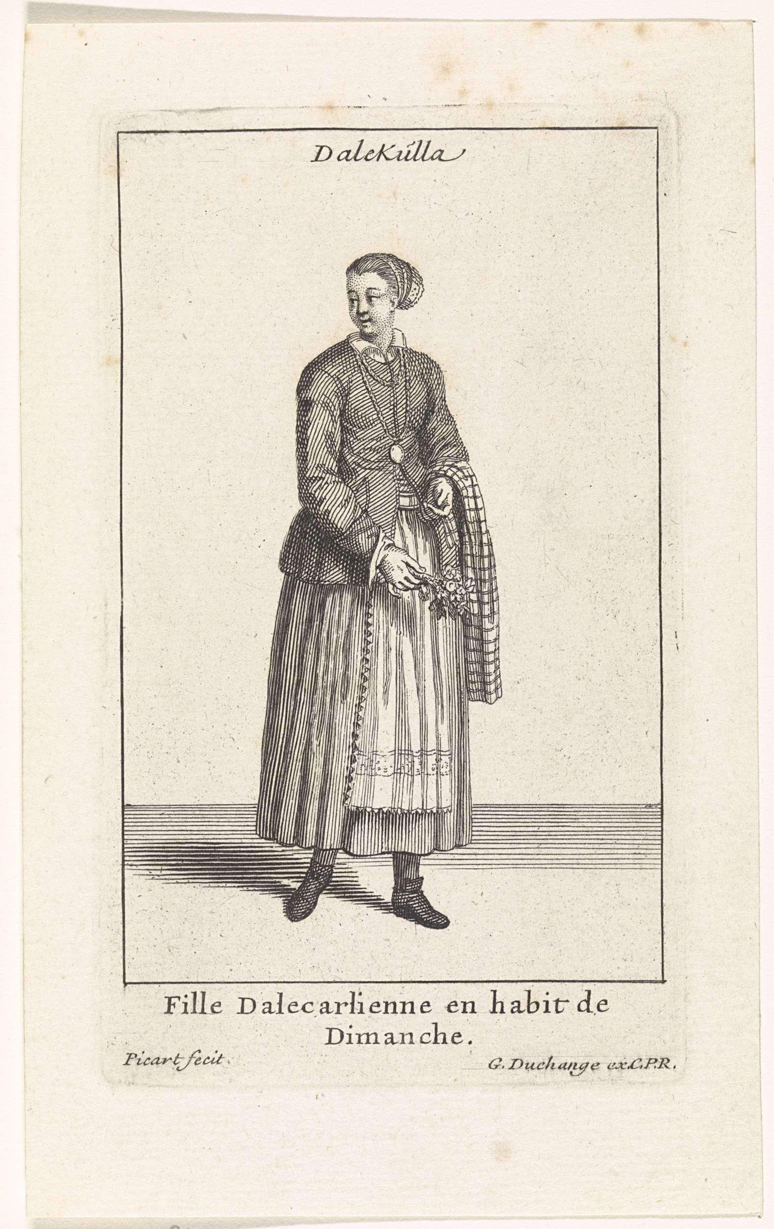 Figuur in eigentijds kostuum. De prent heeft een titel in het Zweeds en een onderschrift in het Frans.