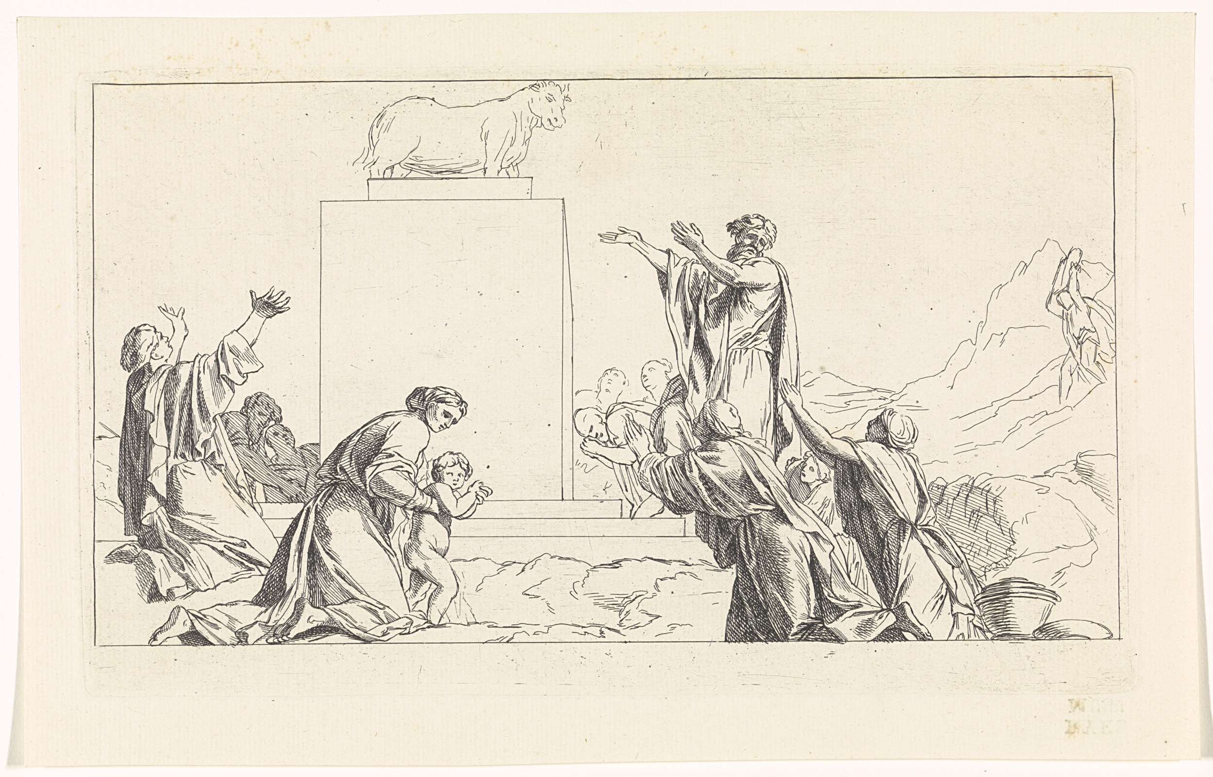 De Israëlieten knielen voor het gouden kalf. Aäron staat naast het beeld en wijst met zijn hand naar het kalf. Rechts op de achtergrond Mozes die terug komt van de berg Sinaï. Uit woede over de afgoderij van de Israëlieten smijt hij de tafelen stuk.
