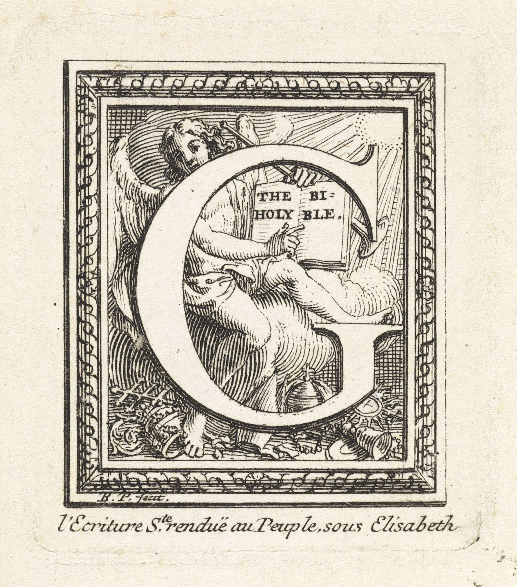 De letter en het inititaal G met op de achtergrond een engel, die op een opengeslagen Engelse Bijbel wijst. Op de grond verschillende kerkelijke rooms-katholieke attributen, waaronder een pauselijke tiara. Onderaan een verklarende tekstregel in het Frans, waarin staat dat Elizabeth I Tudor, koningin van Engeland, de Bijbel aan het volk terug heeft gegeven.