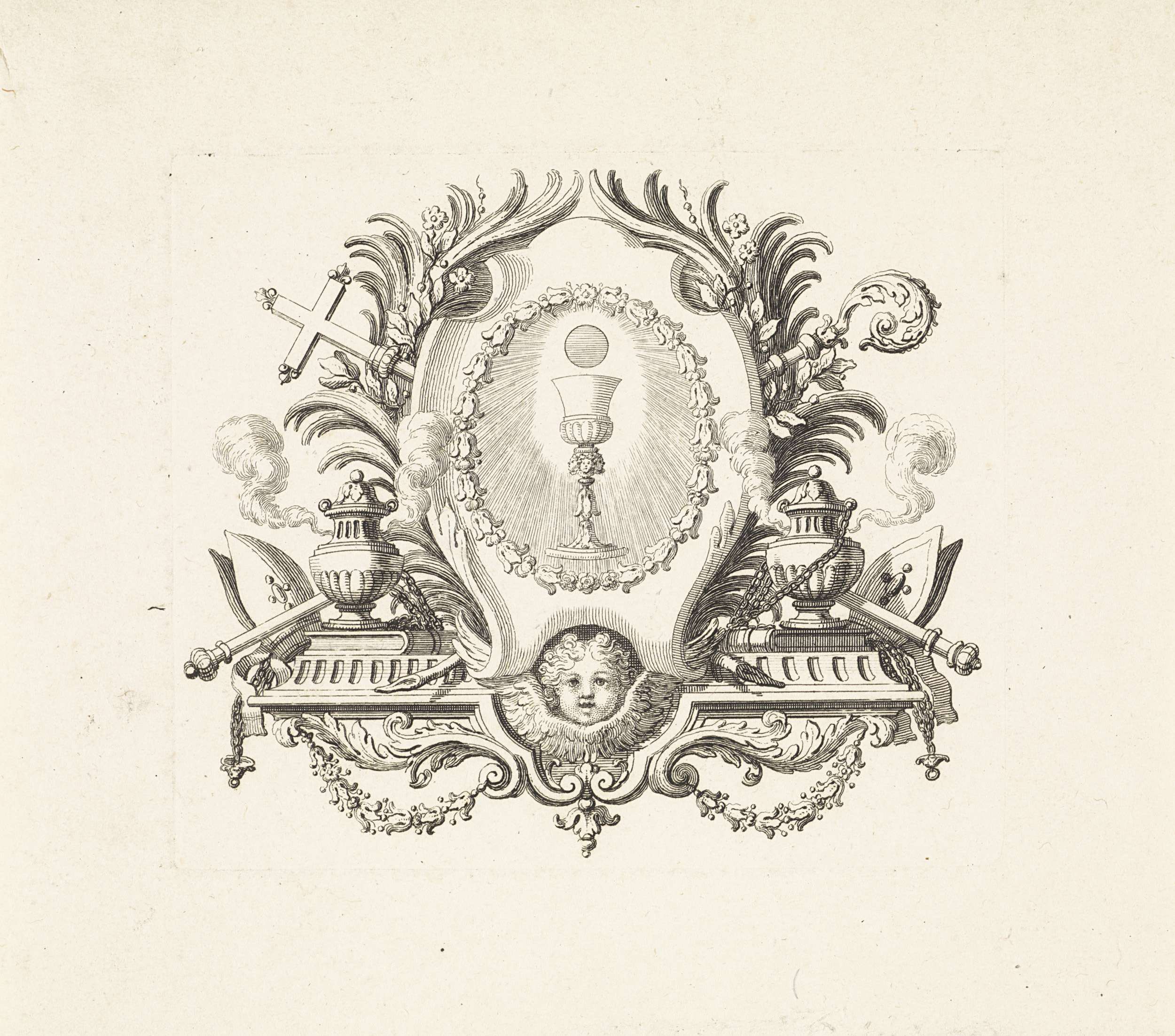 Een cartouche met een miskelk en hostie. Rond het cartouche attributen uit de rooms-katholieke liturgie, waaronder een mijter, wierookvat, kruis en bisschopsstaf.