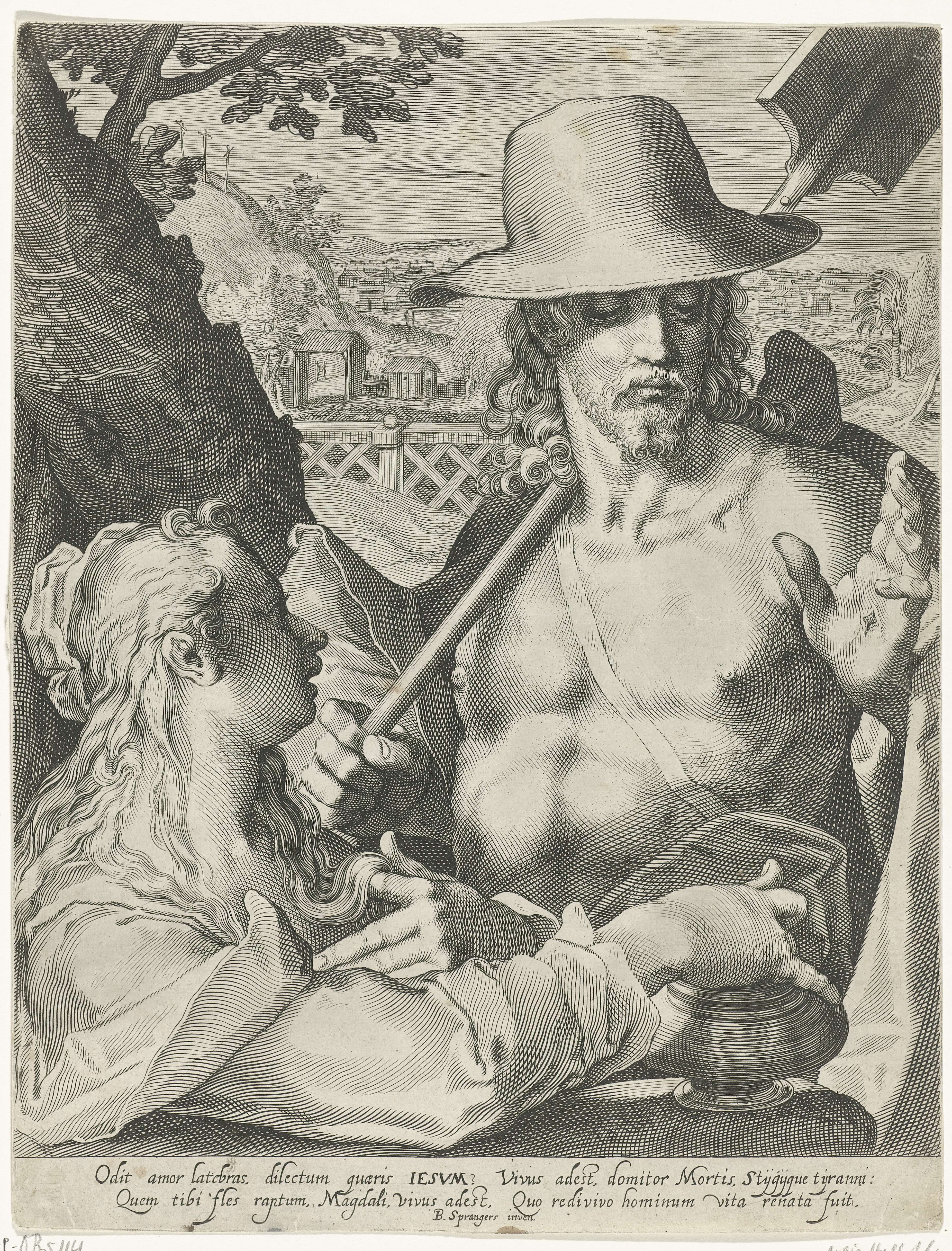 De verrezen Christus verschijnt aan Maria Magdalena in de gedaante van een tuinman. Zijn kruiswonden zijn zichtbaar. Maria Magdalena heeft een zalfpot in de hand. De prent heeft een Latijns onderschrift.