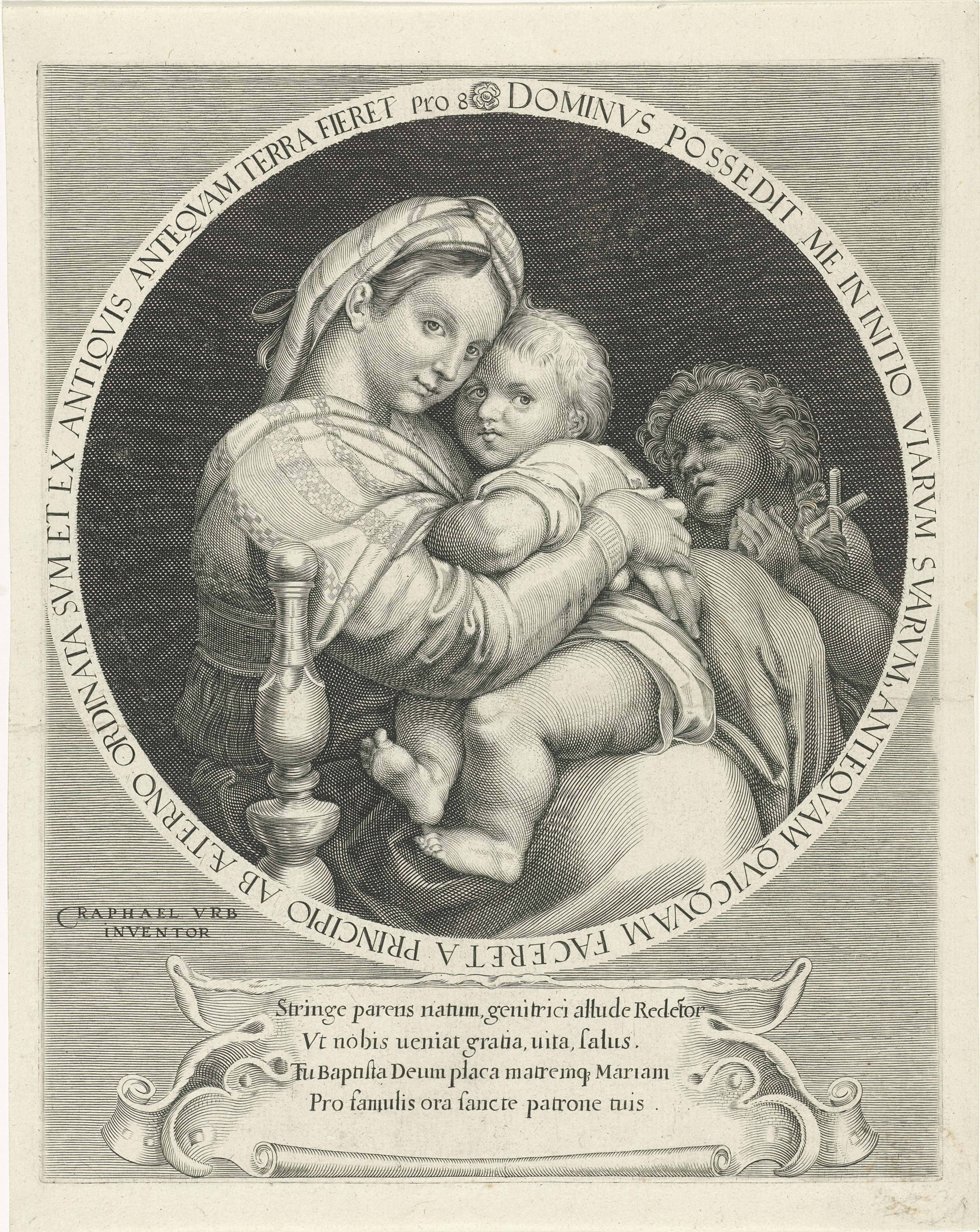 In een rond kader Maria met het Christuskind op haar schoot. Op de achtergrond de jonge Johannes de Doper. Onder het kader een Latijnse tekst in een banderol.