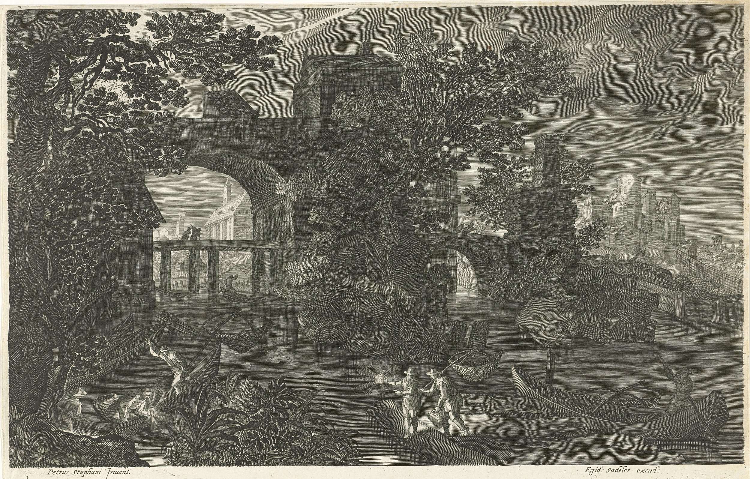 Vissers met bootjes bevaren een rivier in de nacht. Op de achtergrond een brug. De vijfde prent van een achtdelige reeks met landschappen in Bohemen