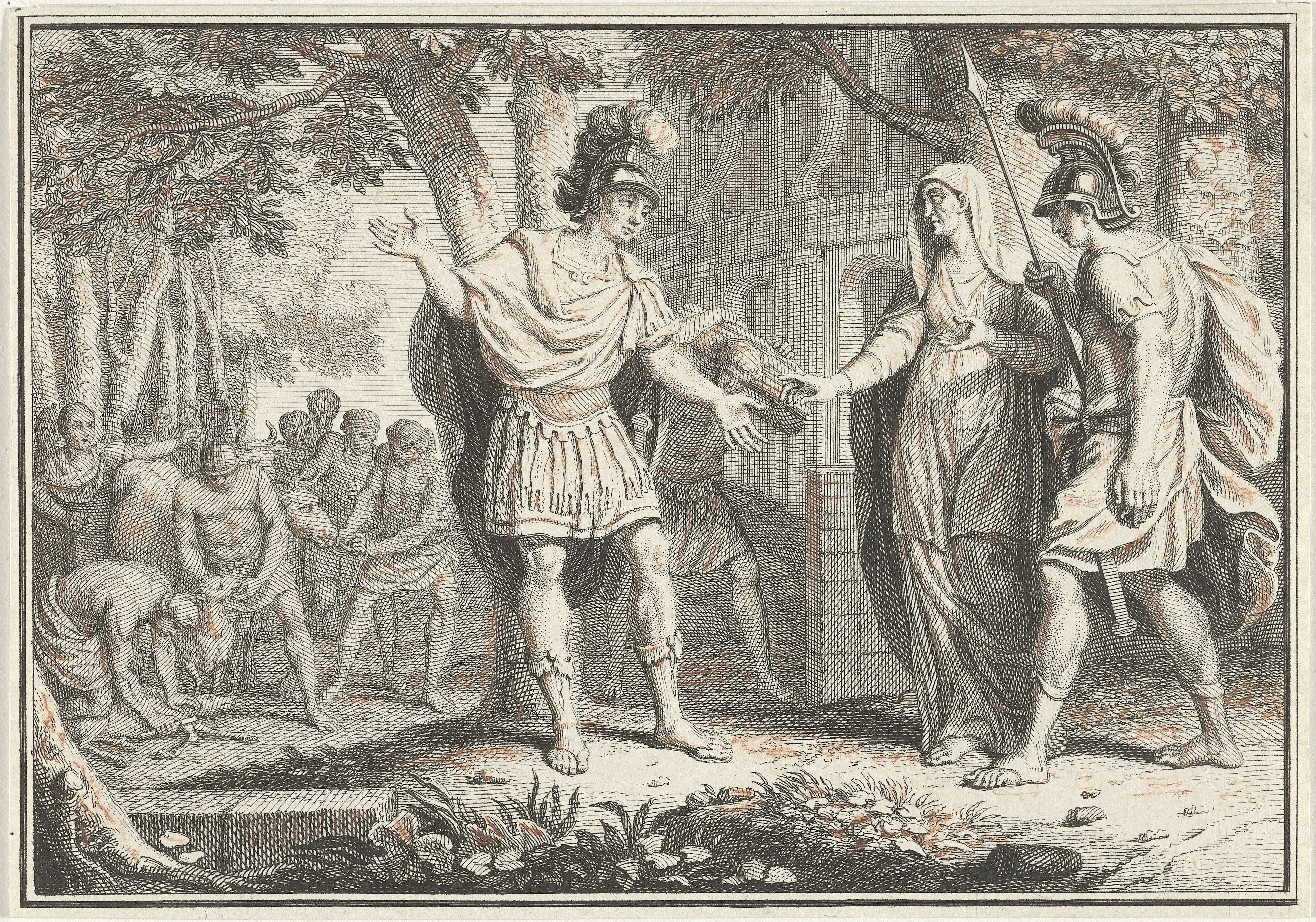 Aeneas bezoekt, vergezeld door zijn vriend Achates, de Sibille van Cumae om haar te vragen nog eenmaal het gezicht van zijn vader te mogen zien. Op de achtergrond worden in opdracht van de Sibille zeven stieren en schapen geofferd opdat ze van start kon gaan met haar voorspellingen.