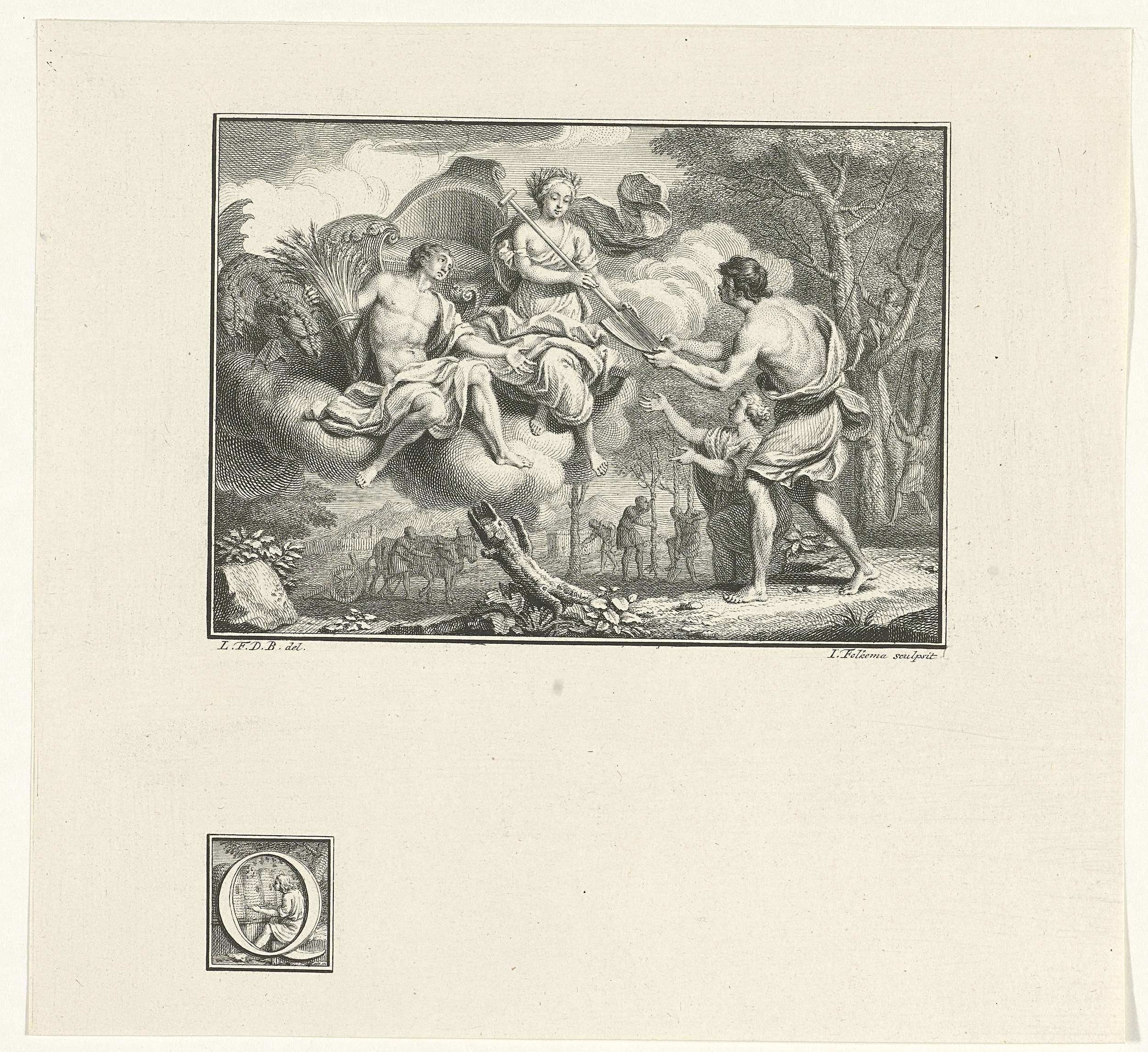 Ceres, godin van de landbouw, verschijnt op het platteland waar ze een boer en boerin een schep overhandigt. Zij wordt vergezeld door een allegorische figuur met een korenschoof in zijn armen. Achter dit tweetal zweeft de door draken voortgetrokken wagen van Ceres in de lucht. Op dezelfde plaat staat links onder deze voorstelling een versierd ...