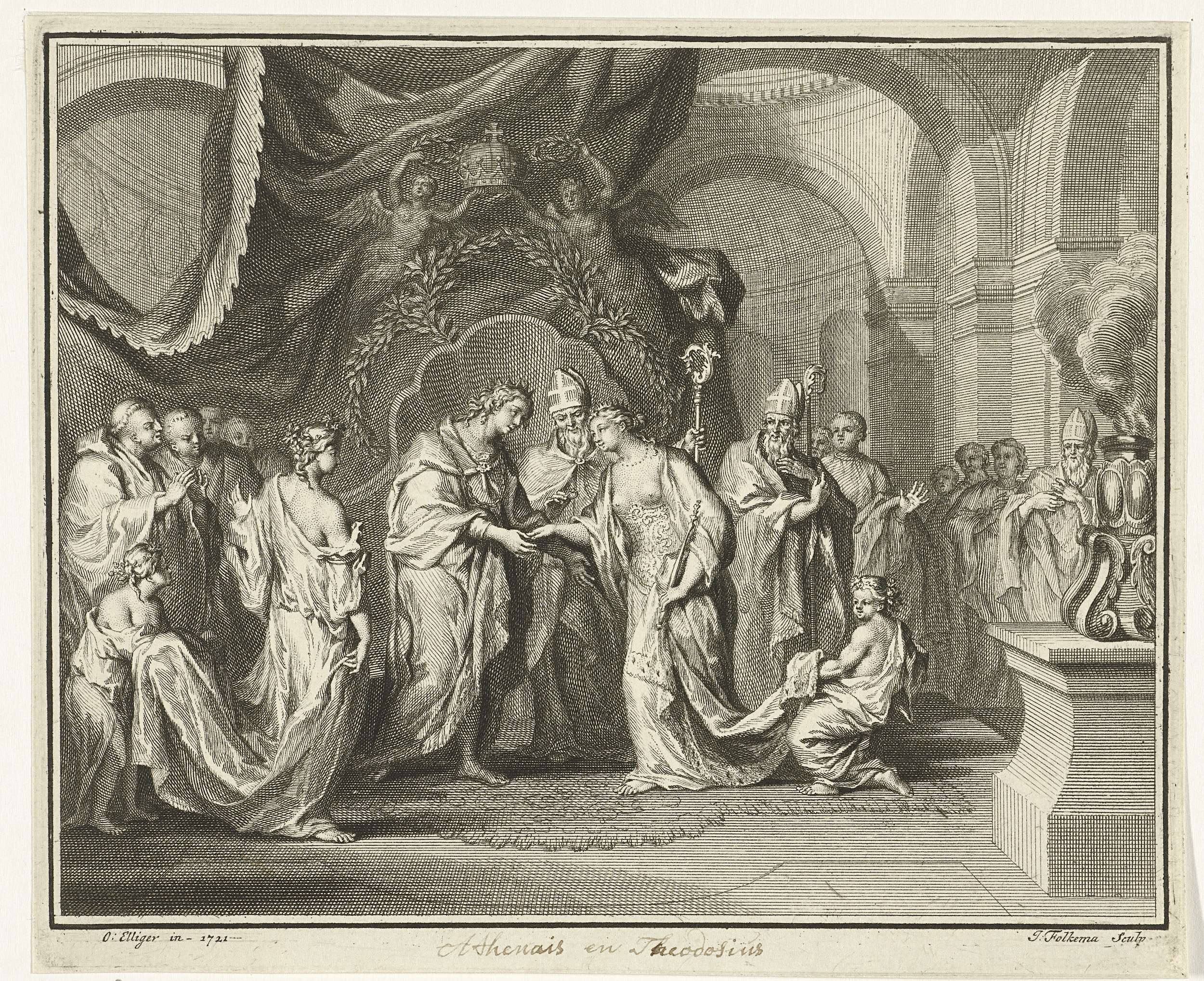 Omringd door genodigden worden Athenais en keizer Flavius Theodosius door een bisschop met elkaar in de echt verbonden.