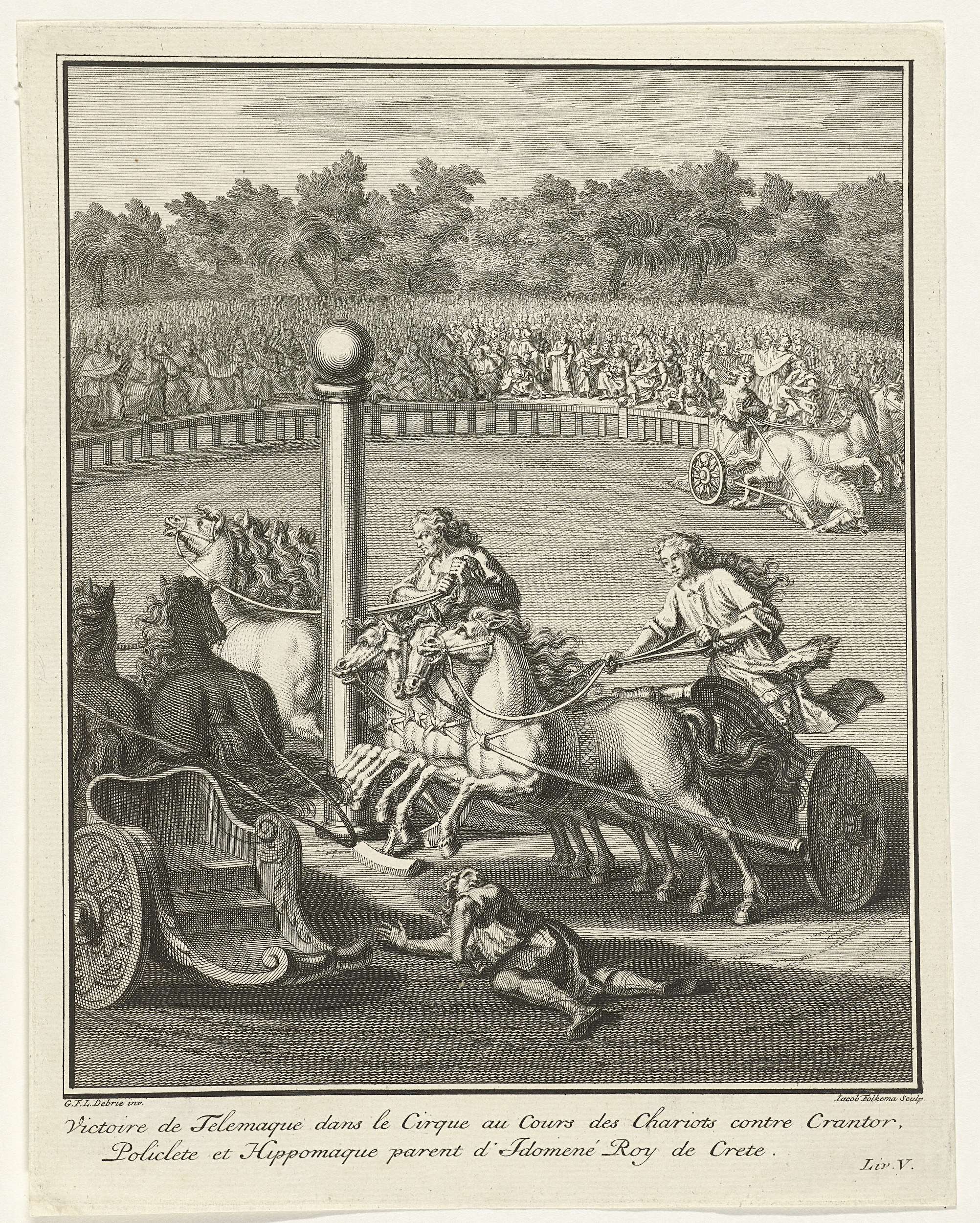 Een menigte toeschouwers kijkt toe hoe Telemachus het wagenrennen in een Romeins circus wint. In de marge staat een tweeregelige tekst in het Frans, rechtsonder gemerkt: Liv. V. Illustratie vervaardigd bij boek 5 uit "Avonturen van Telemachus", geschreven door François de Fénélon.