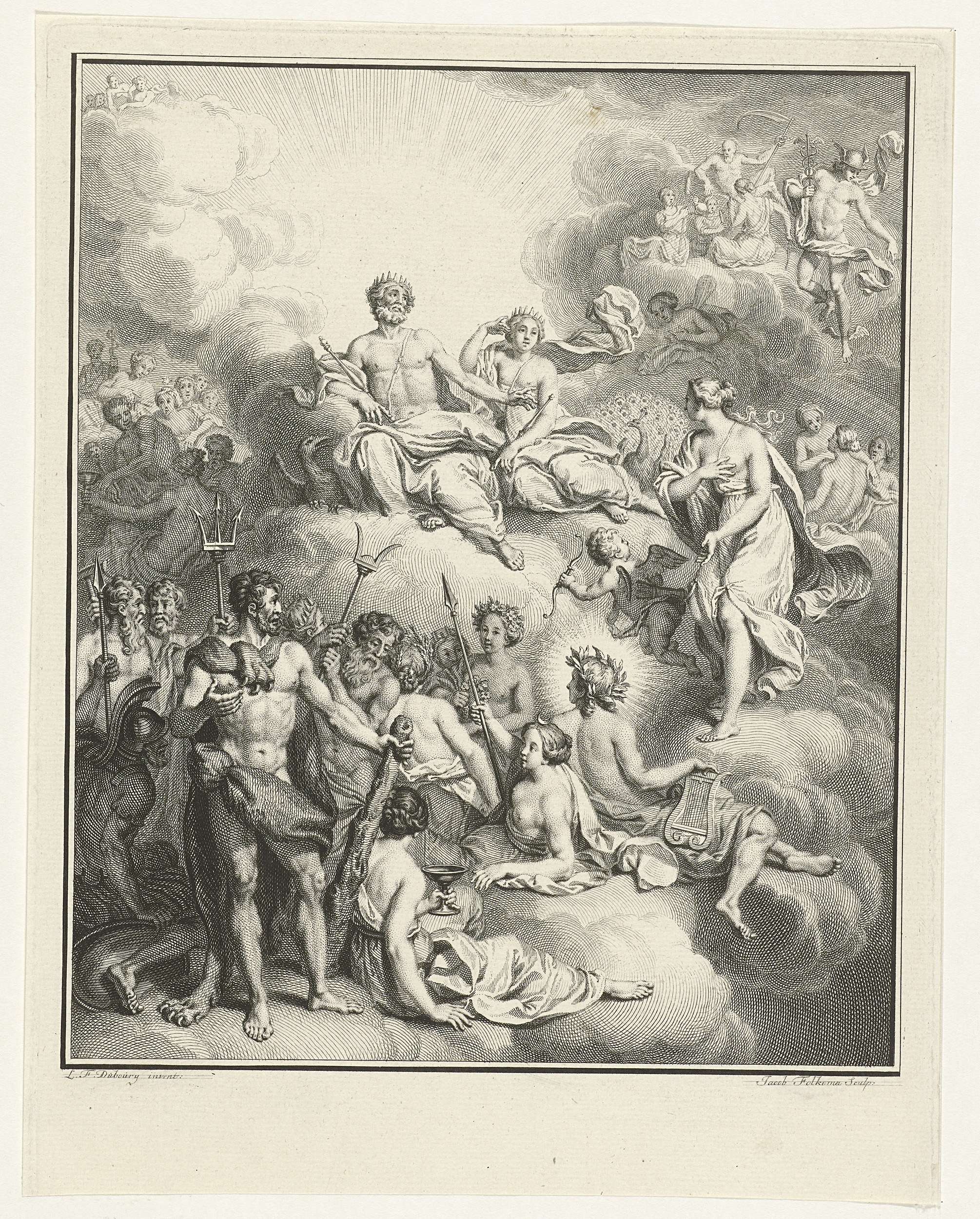 Venus vraagt in de vergadering der goden toestemming aan Jupiter om Telemachus te vernietigen. Jupiter troont samen met zijn echtgenote Juno op een wolk en hoort Venus aan. Links kijkt Hercules omringd door allegorische figuren toe. Illustratie vervaardigd bij boek 9 uit "Avonturen van Telemachus", geschreven door François de Fénélon.