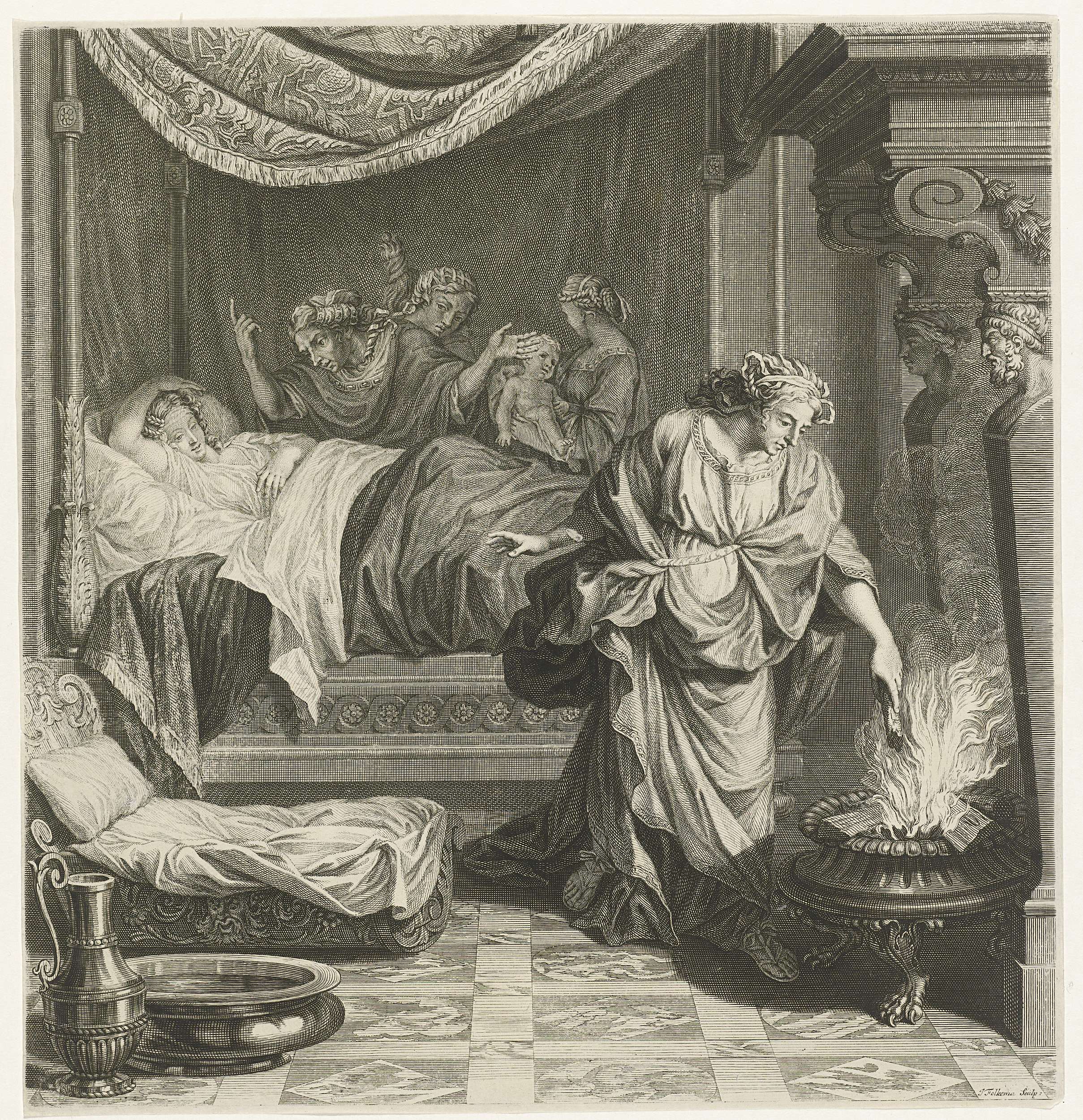 Interieur met drie schikgodinnen bij het kraambed van Althaea, de moeder van Meleager. Bij de geboorte van Meleager bepaalden de schikgodinnen dat hij zou sterven wanneer een bepaald houtblok in het vuur was verteerd. Rechts wordt het betreffende houtblok uit het vuur gehaald.
