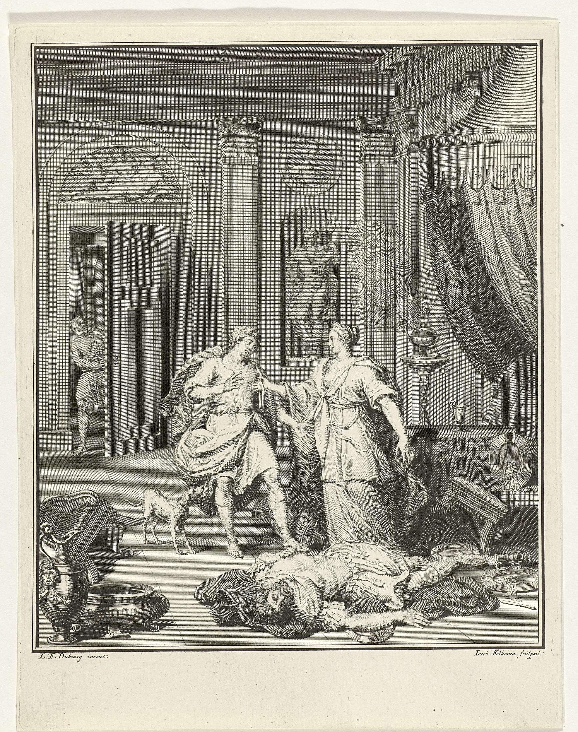 Wanneer Pygmalion, koning van Tyrus, erachter komt dat zijn vrouw Astarbe er een minnaar genaamd Joazar op nahoudt, wil hij deze man vergiftigen. De koning wordt uiteindelijk zelf de dupe van zijn plan en ligt in de voorstelling vergiftigd op de grond. Hierachter staat Astarbe die haar minnaar de ring van Pygmalion schenkt, in de ...