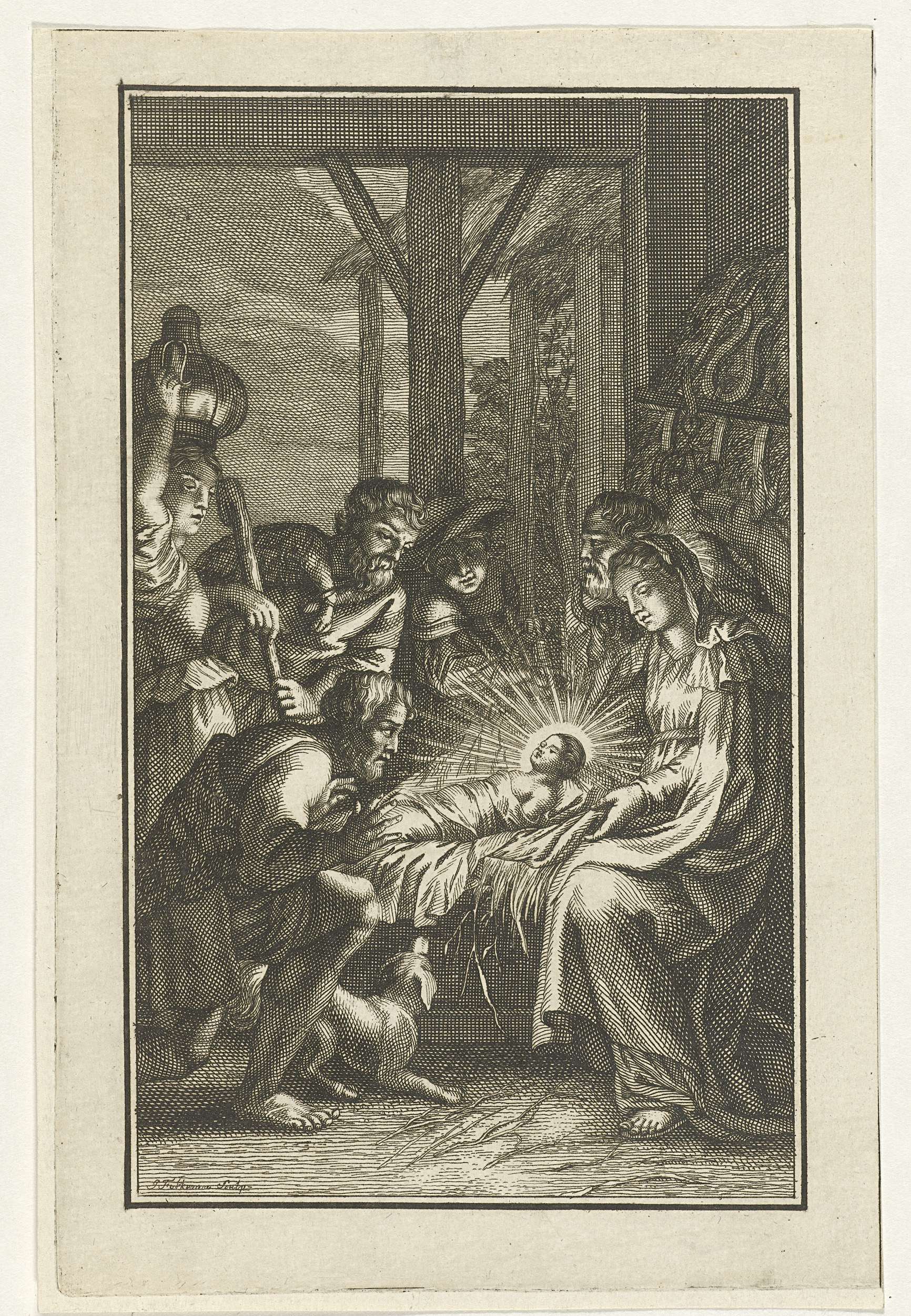 Het Christuskind wordt, in het bijzijn van Maria en Jozef, aanbeden door de herders die zich met hun geschenken rondom het Kind hebben opgesteld.