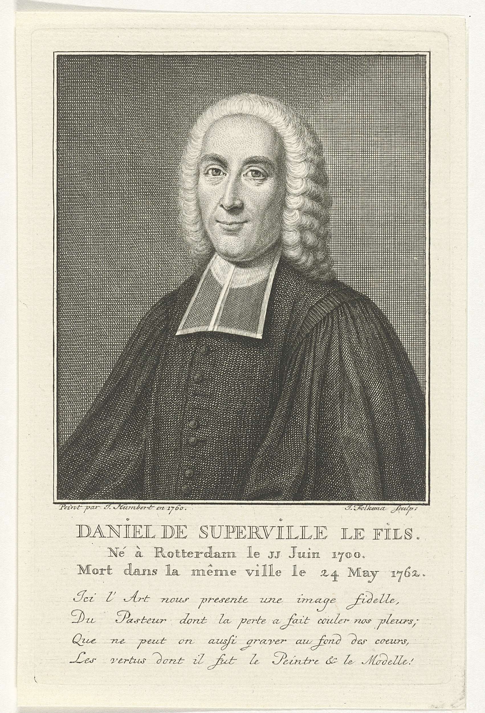Portretbuste naar links van de Waalse predikant Daniel de Superville, blootshoofds en gehuld in een toga. Onder het portret staan zijn naam, geboorte- en sterfdatum en een vierregelige tekst in het Frans.